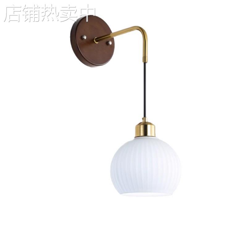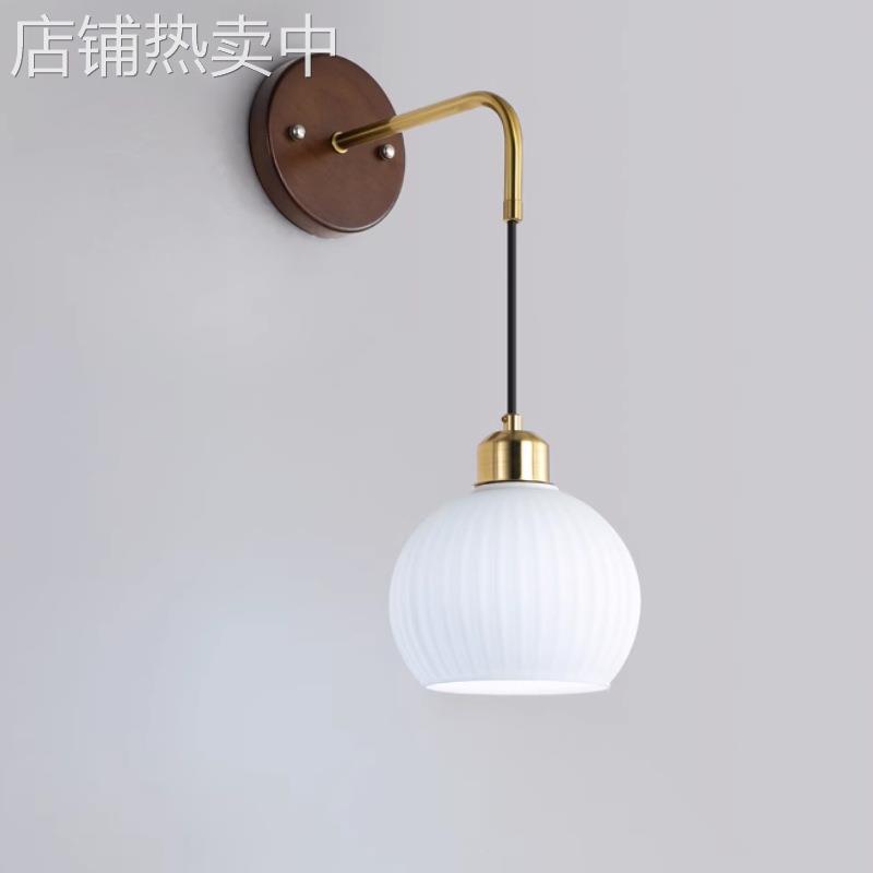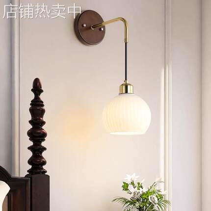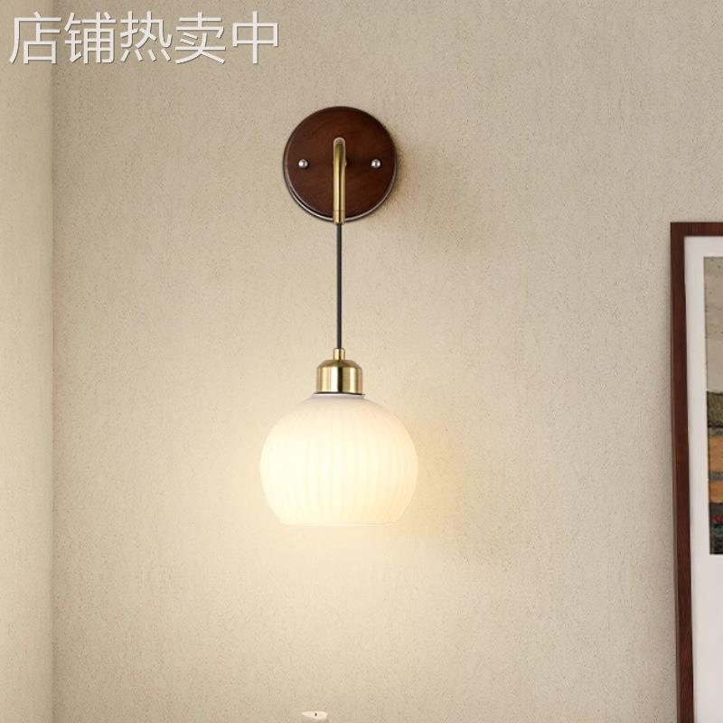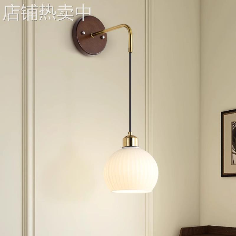 壁灯卧室轻奢胡桃色背景墙吊线灯走廊过道壁灯中古风复古床头壁灯