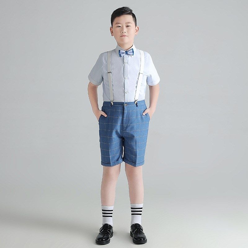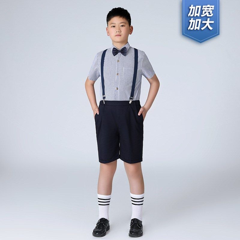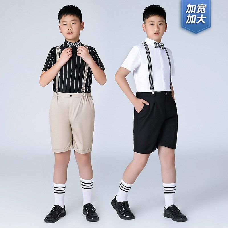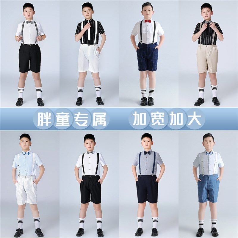 胖版男童背带裤套装夏季儿童加肥加大短袖衬衫短裤主持钢琴演出服