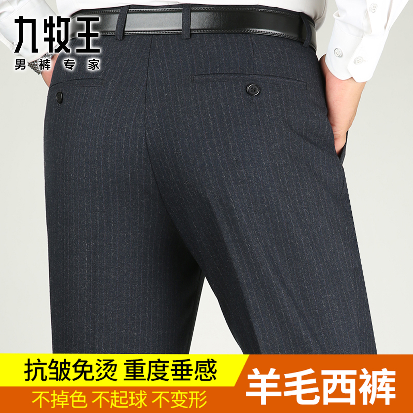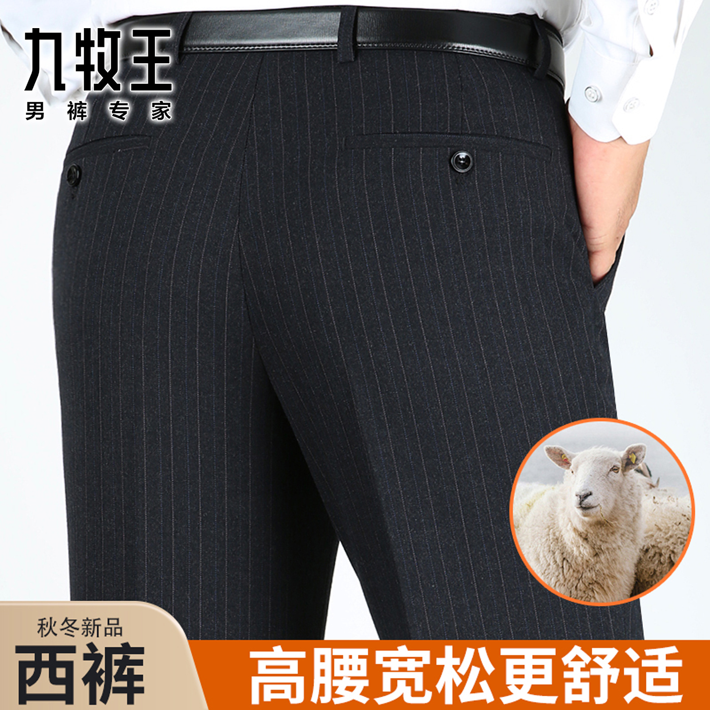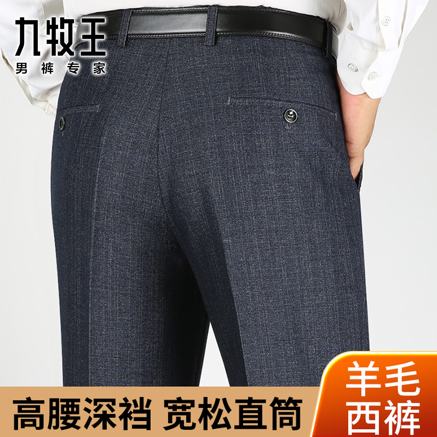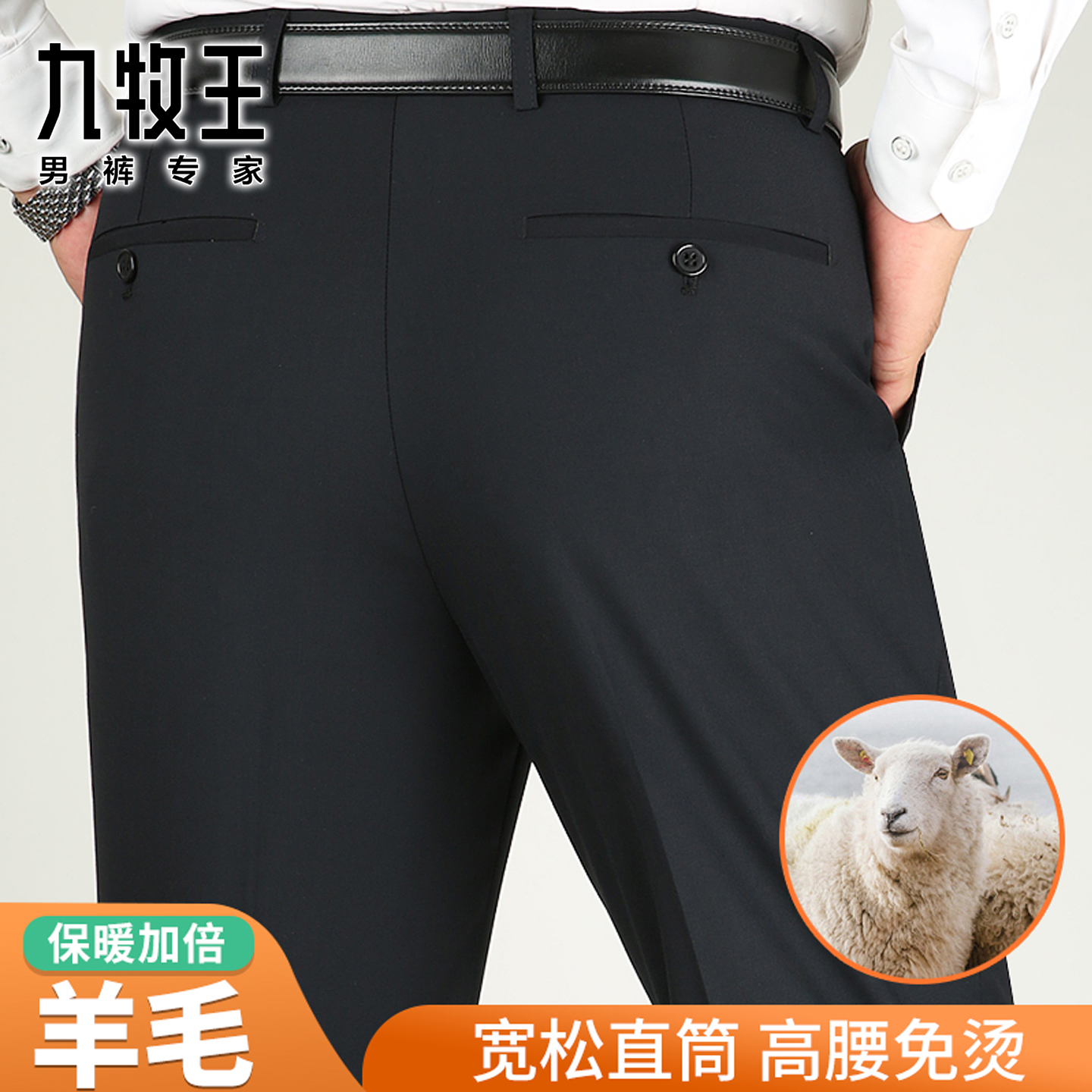 九牧王秋冬厚款羊毛西裤男高腰深裆直筒宽松垂免烫中老年加绒男裤