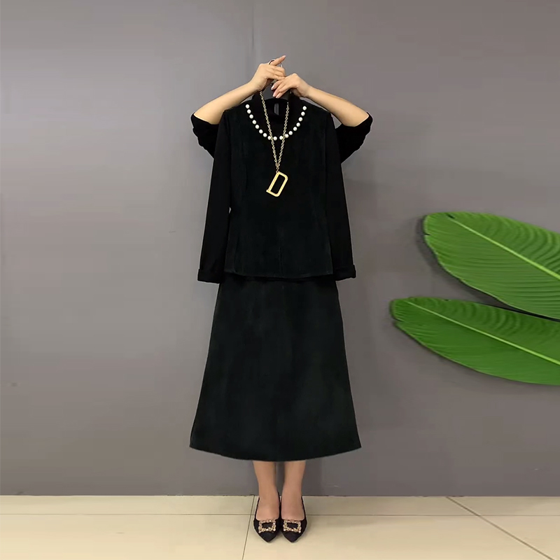 胖妹妹钉珠边圆领收腰压褶马甲长袖打底衫半身裙冬季款通勤三件套