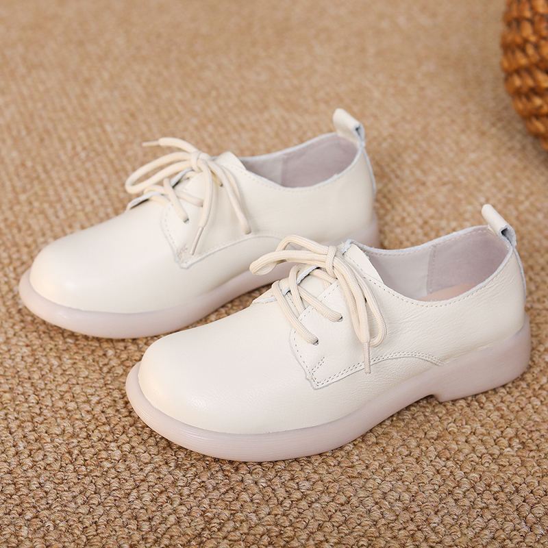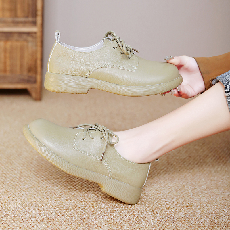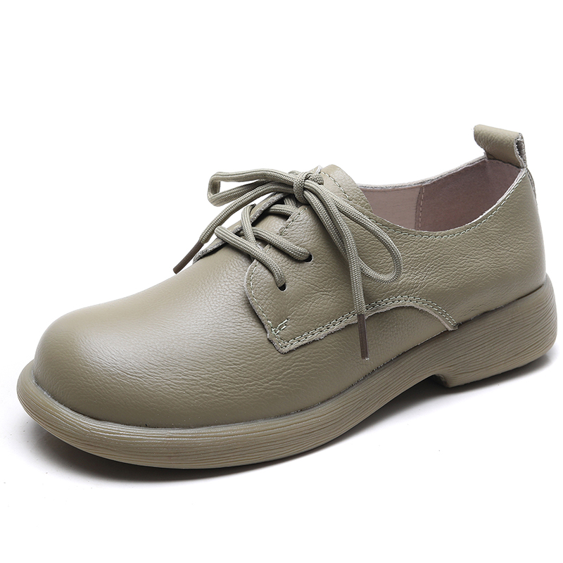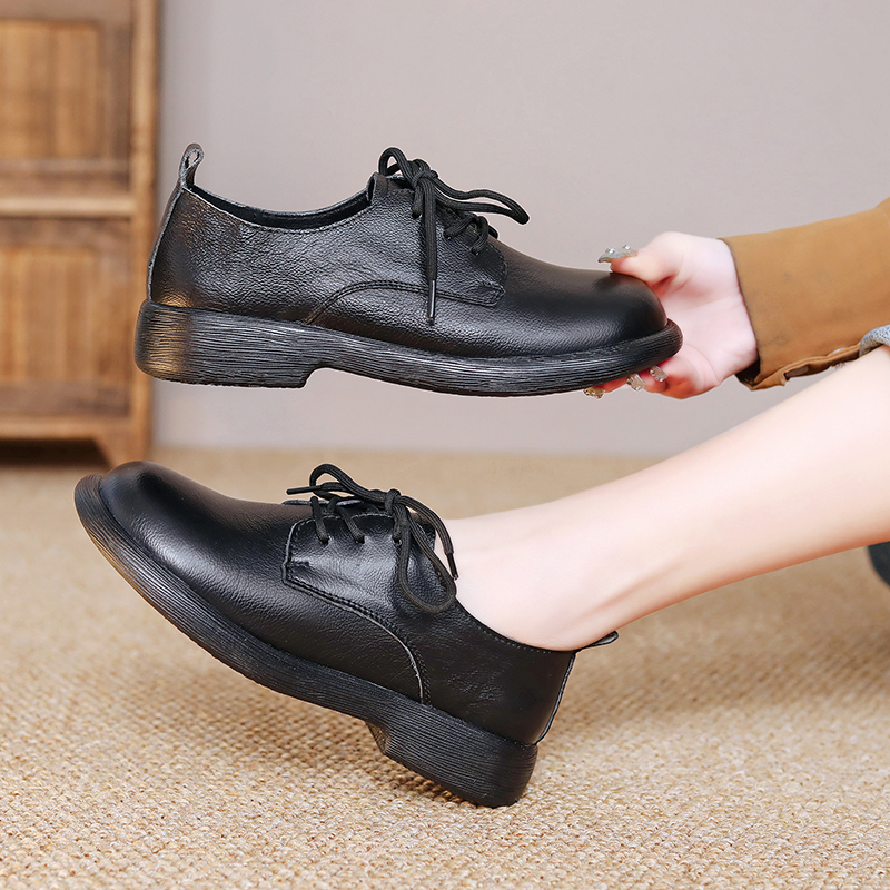 头层牛皮皮鞋厚底复古圆头真皮防滑软底单鞋舒适平底妈妈系带女鞋