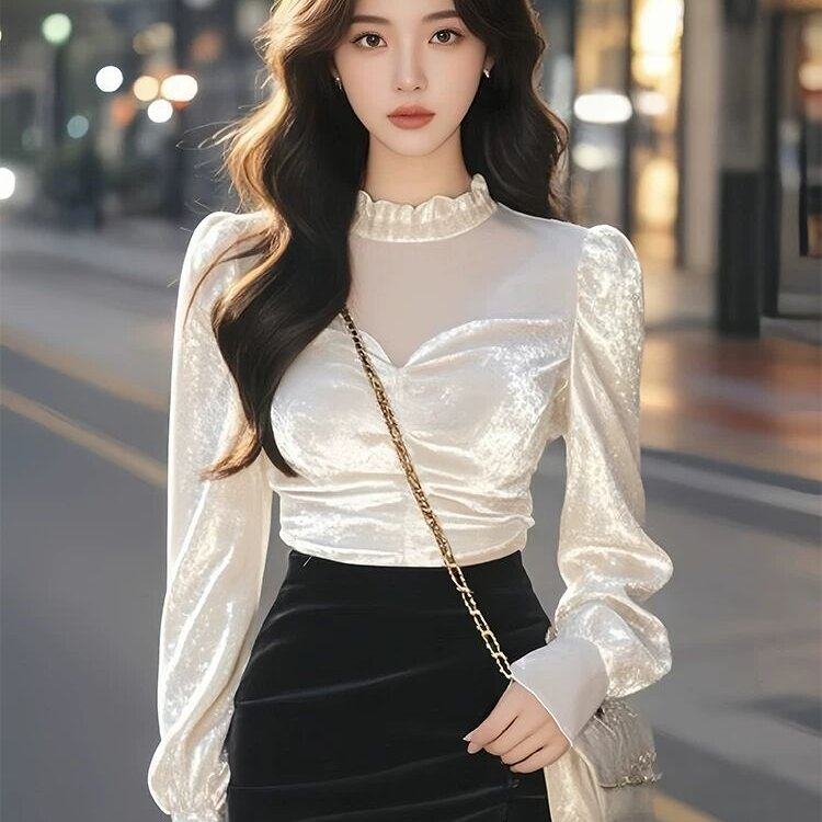 丝绒长袖衬衫女2025新款秋季内搭打底衫高级感法式独特别致小上衣