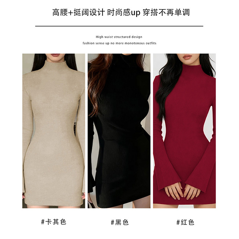 卡其色连衣裙女秋冬季内搭包臀裙高领修身针织初冬巨好看新款爆款