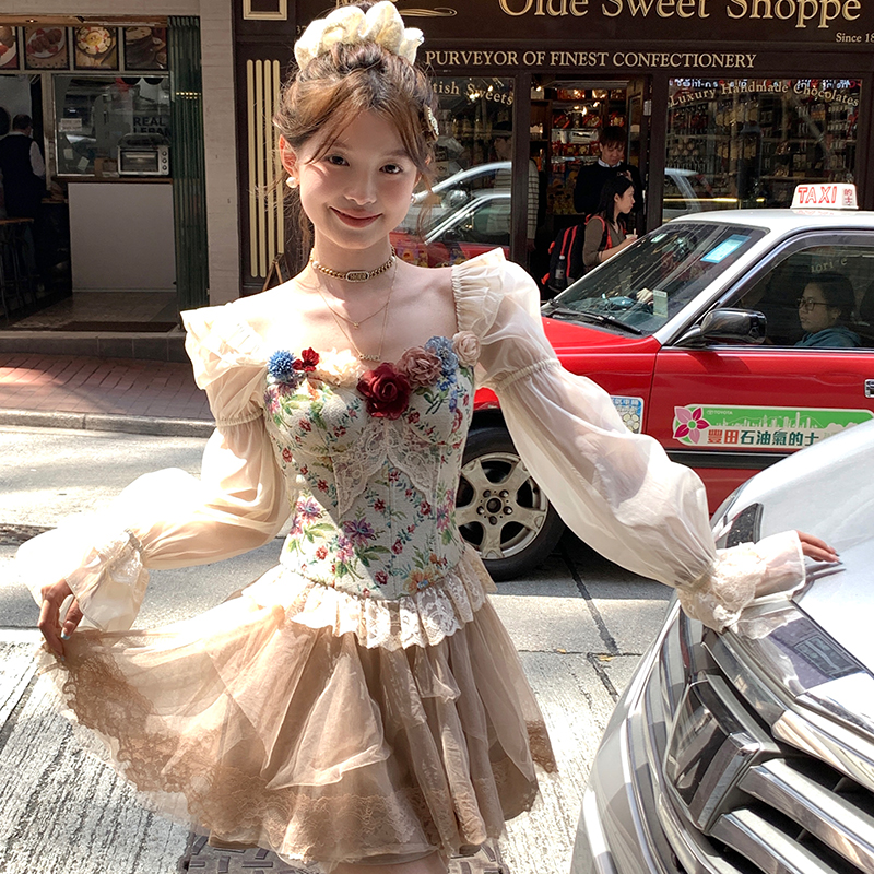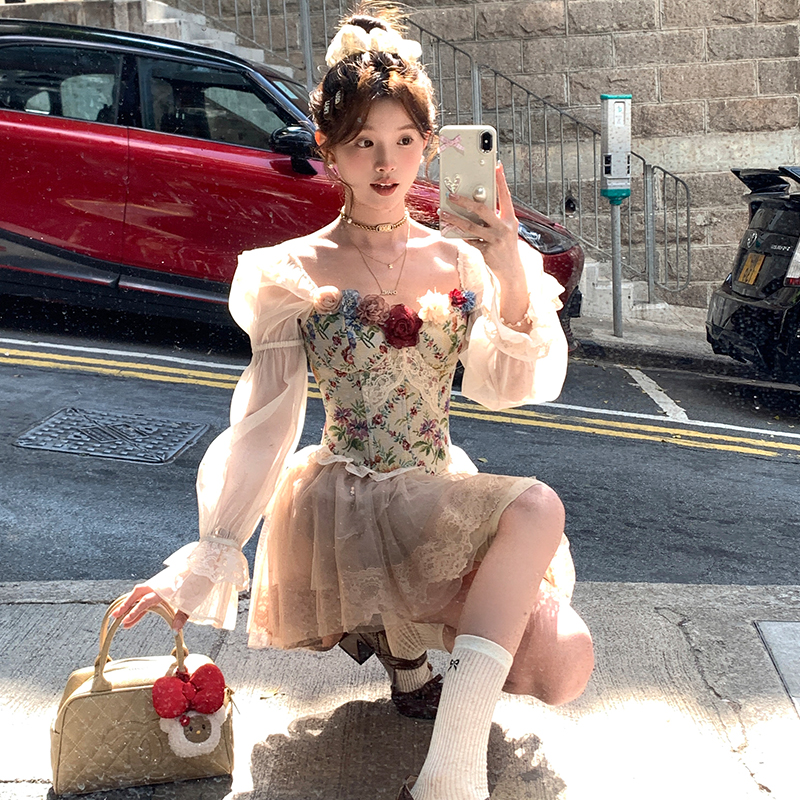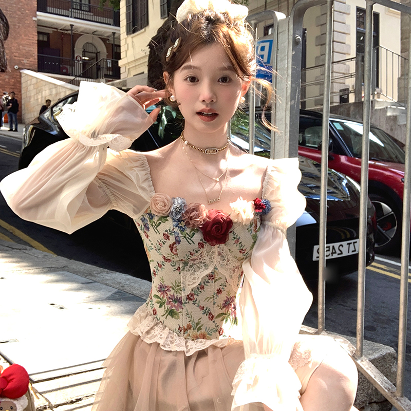 Acaine巴洛克少女/方领短款法式鱼骨长袖衬衫女夏季复古气质上衣