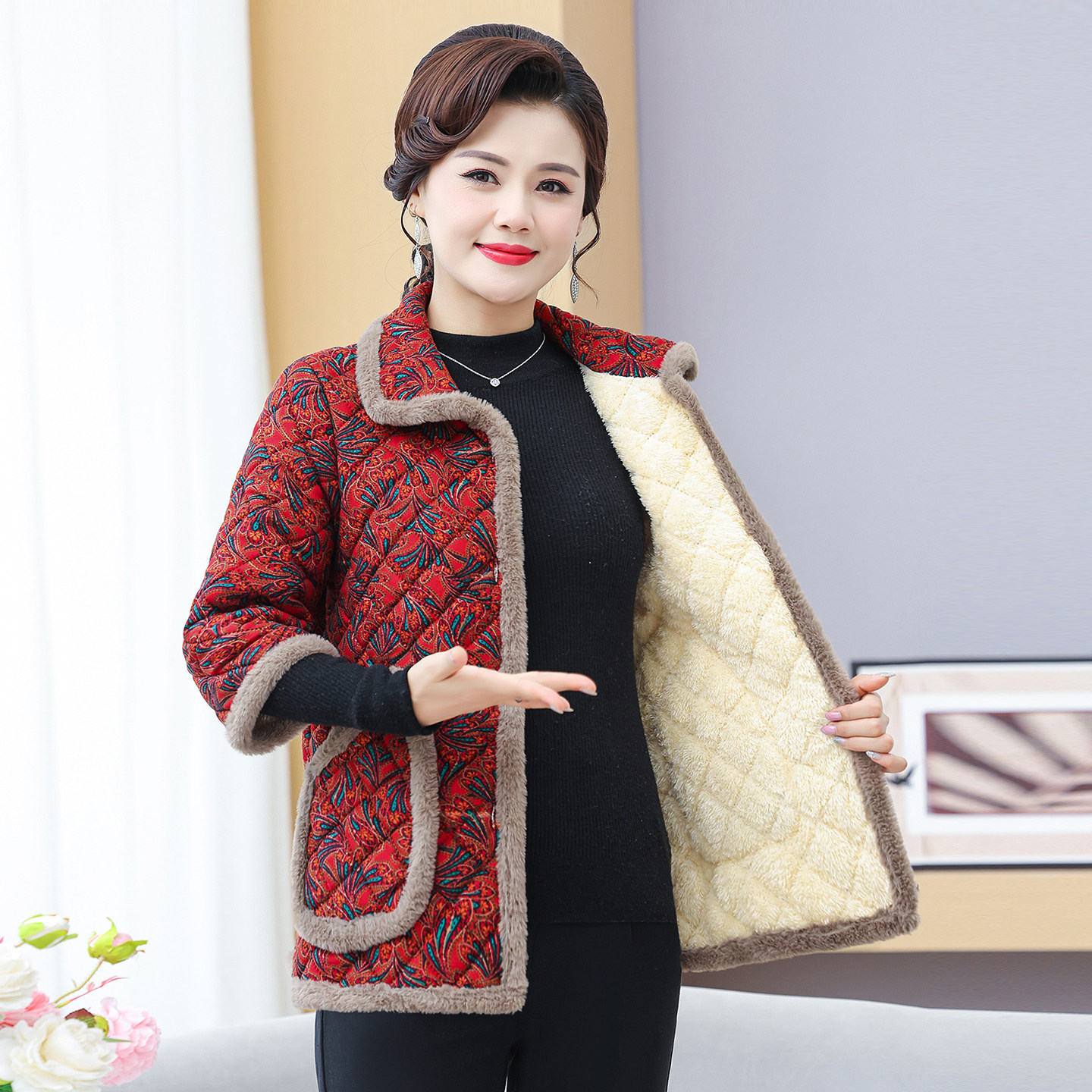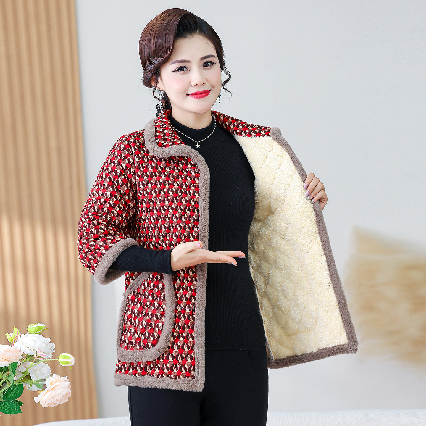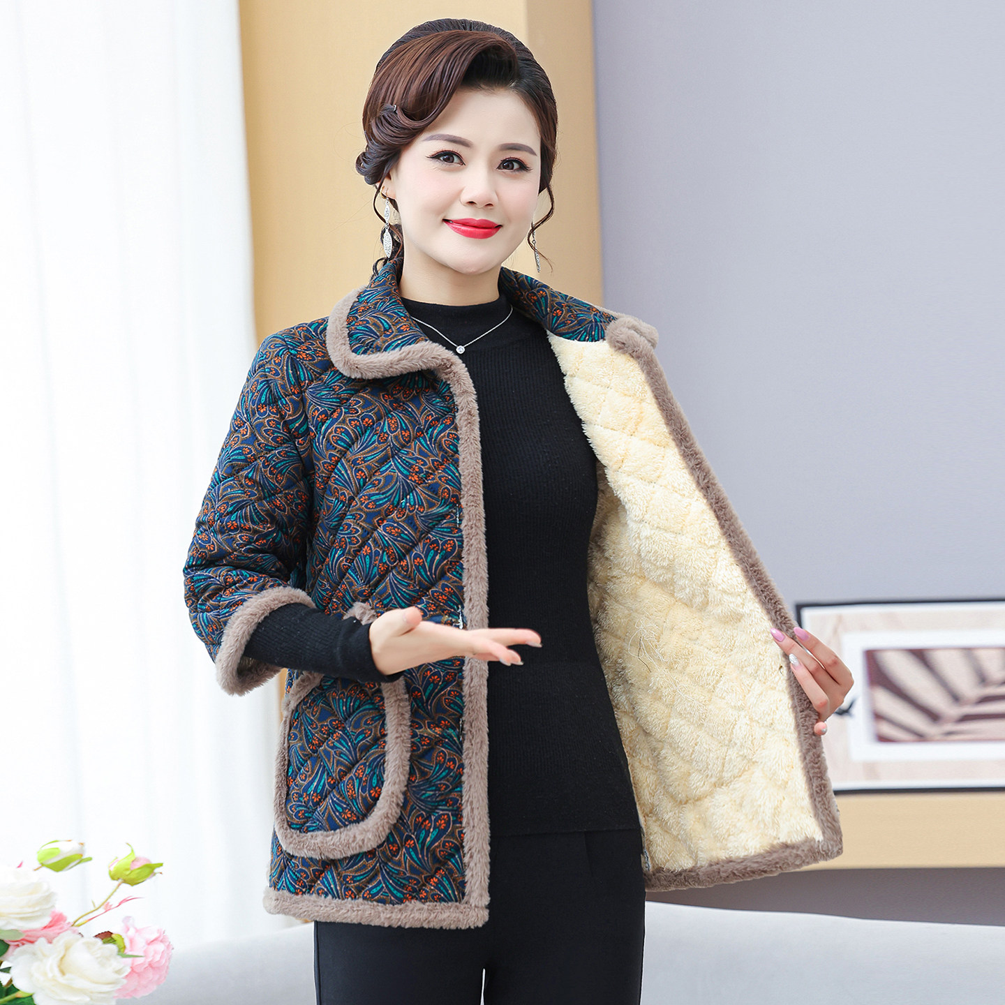 妈妈秋冬七分袖加绒棉衣棉马甲中老年女装大码保暖中袖棉服棉马夹