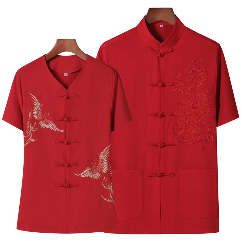 夏季唐装男短袖套装中老年人情侣装爷爷奶奶过寿生日喜庆婚礼衣服