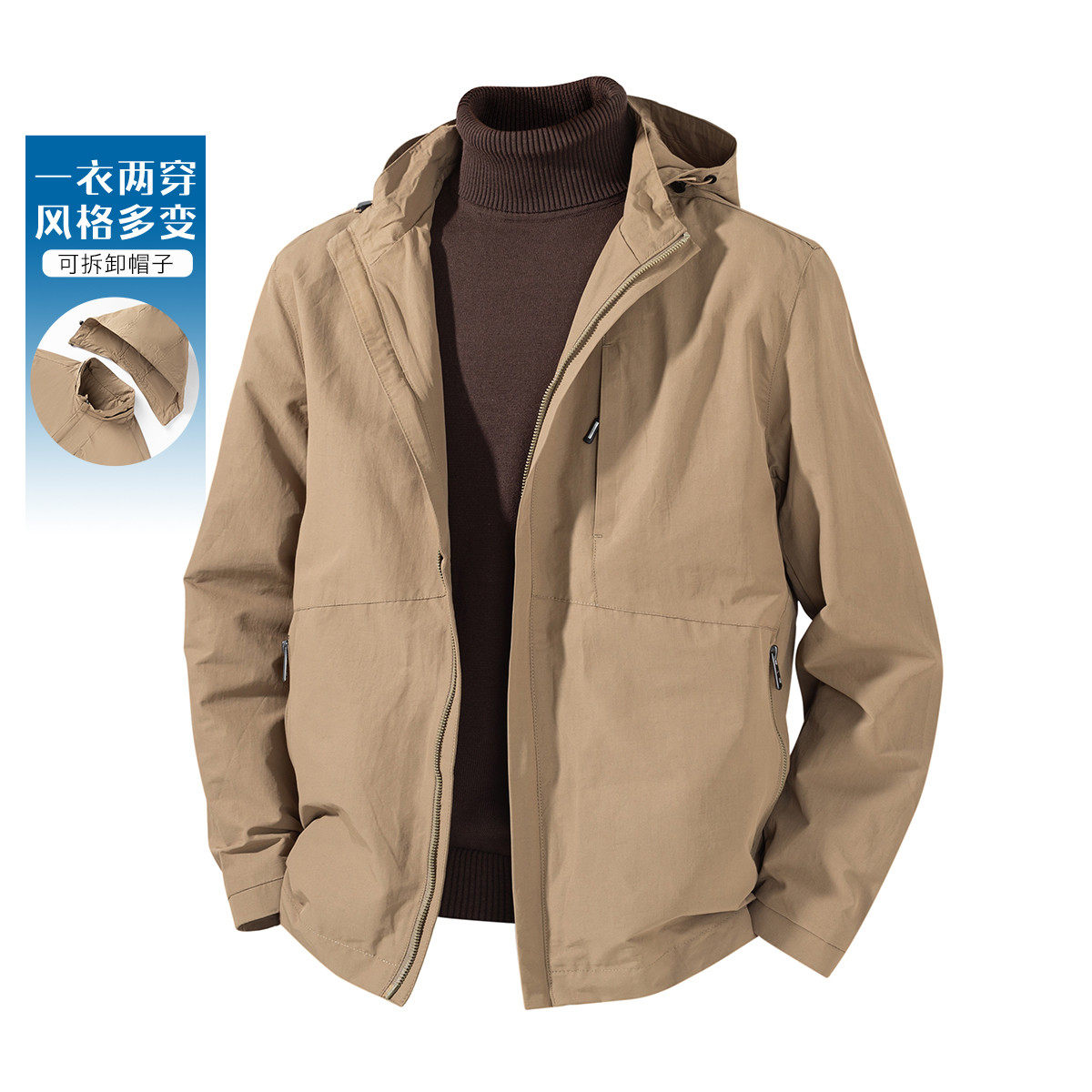 罗蒙春秋男士可拆可脱卸连帽立领夹克拉链口袋冲锋衣风衣含棉外套