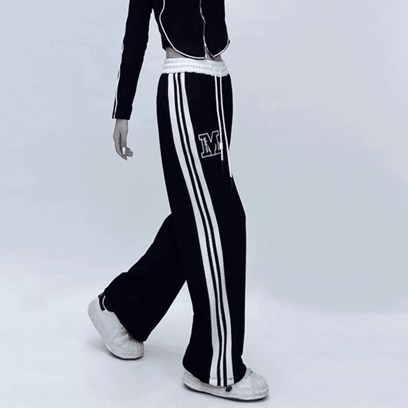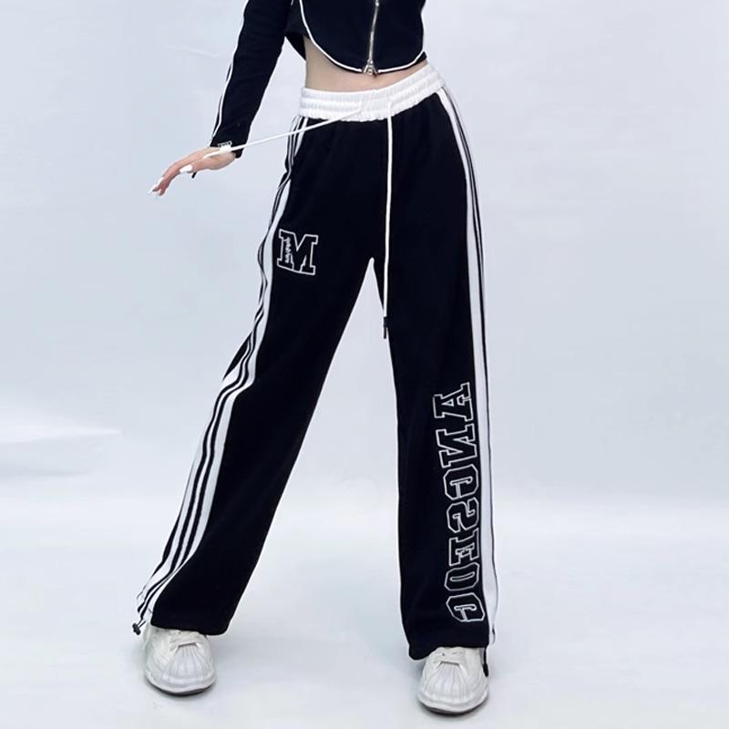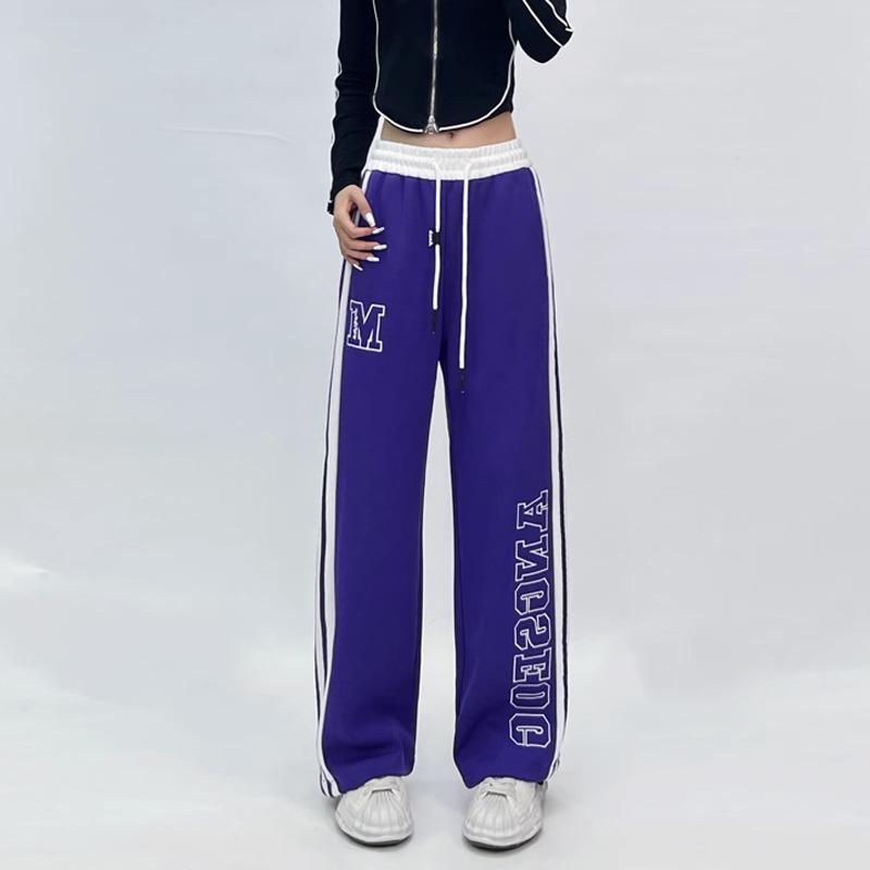 日系拼色条纹运动裤女春夏2024年新款高腰字母刺绣休闲阔腿运动裤