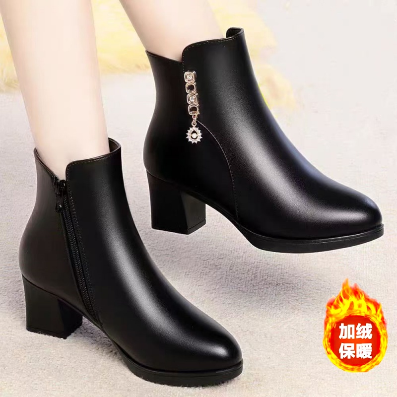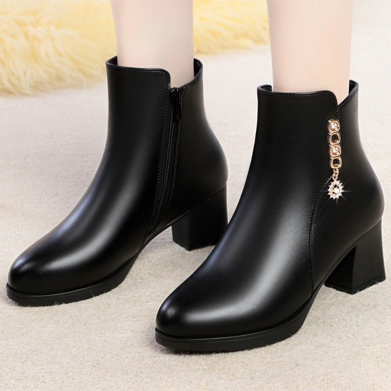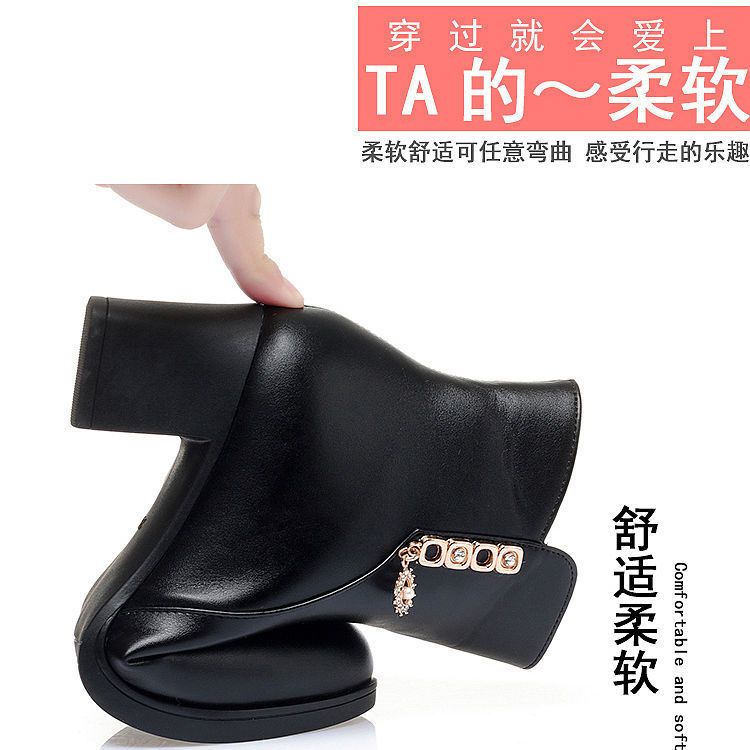 清仓断码真皮妈妈鞋棉鞋秋冬新款粗跟防滑短靴中年女士加绒棉靴子