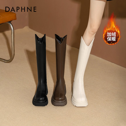 达芙妮v口长筒靴女厚底2025爆款冬加绒骑士瘦瘦靴白色高筒靴子女