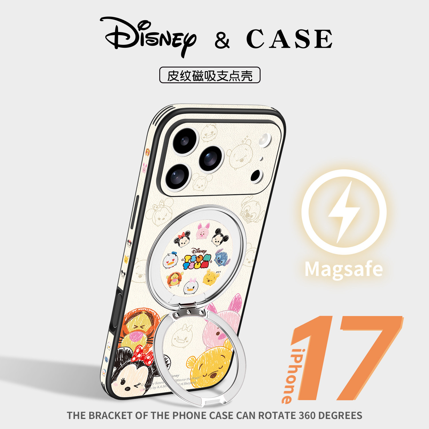 迪士尼正版适用苹果17promax手机壳新款旋转支架iphone17高档皮纹米奇带挂绳磁吸16pro全包防摔超薄小羊皮男