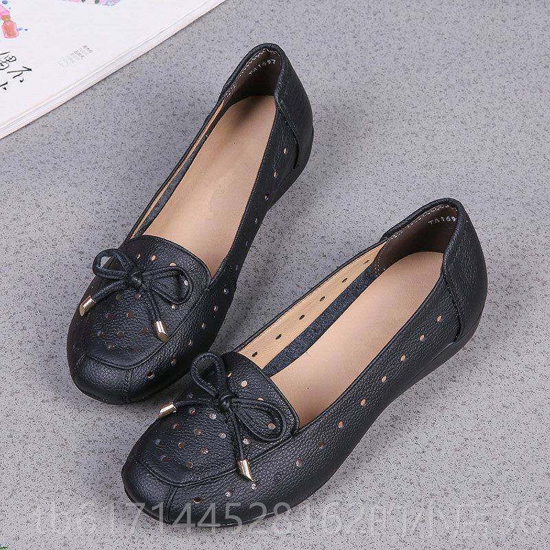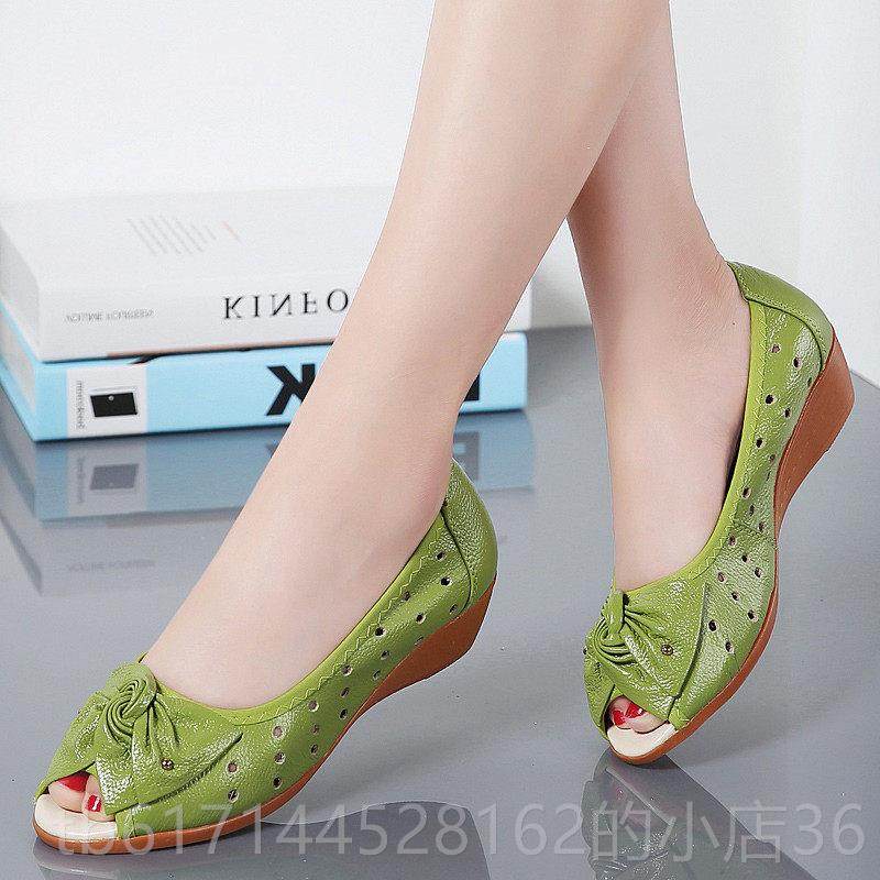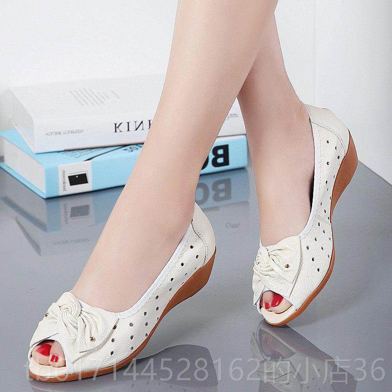 正品中妈妈凉鞋女士夏季真皮软底中年老年中跟鱼嘴鞋大码坡跟平底