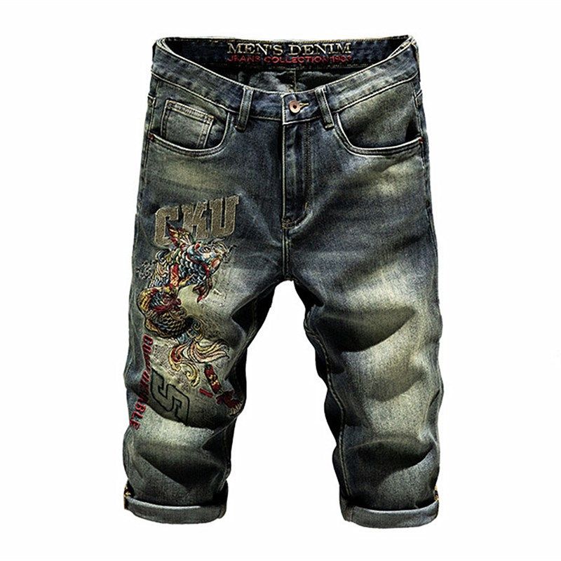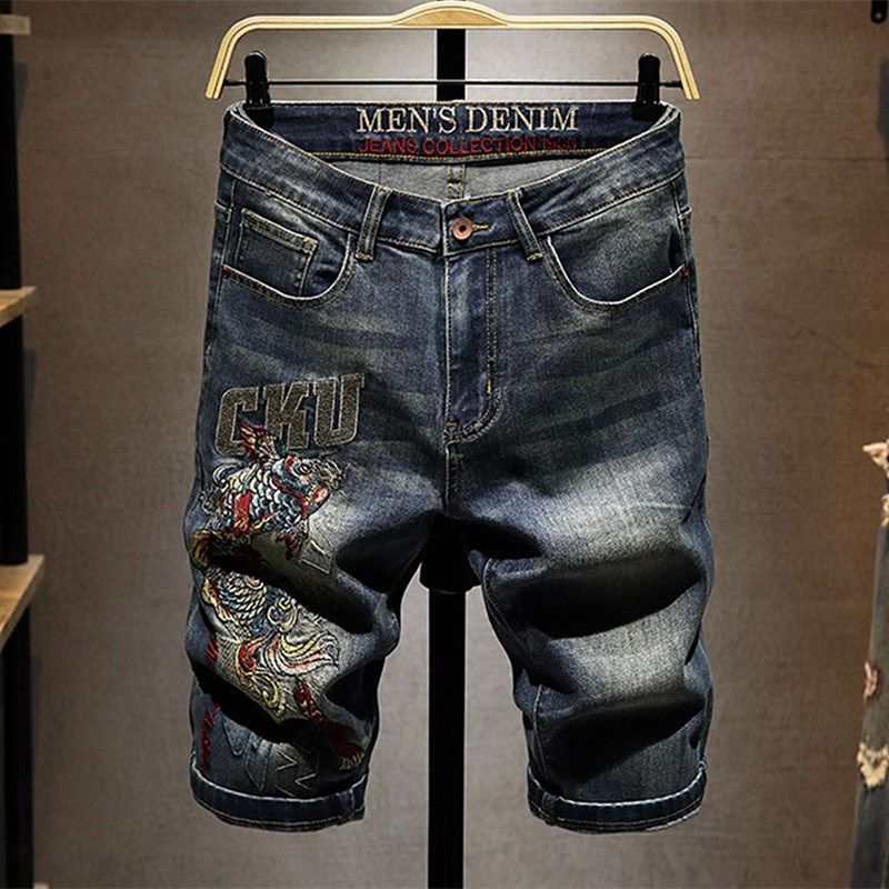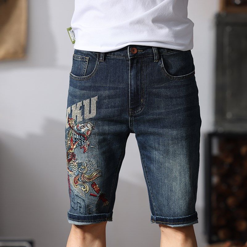 夏季锦鲤刺绣牛仔短裤男款直筒宽松五分中裤休闲薄款弹力七分裤子