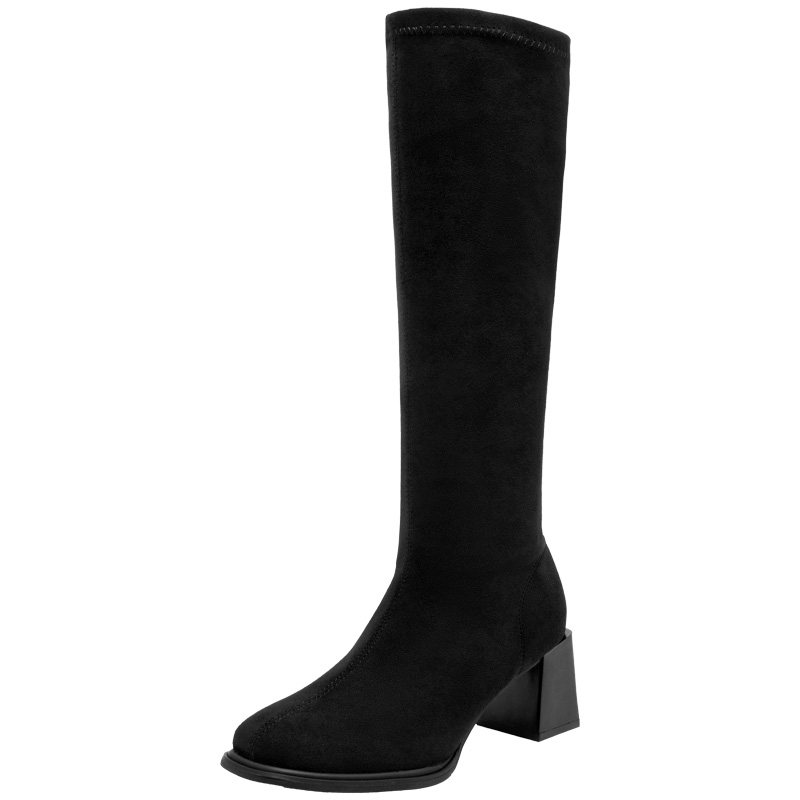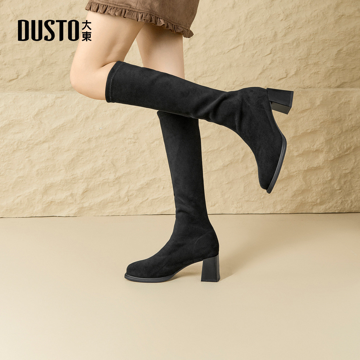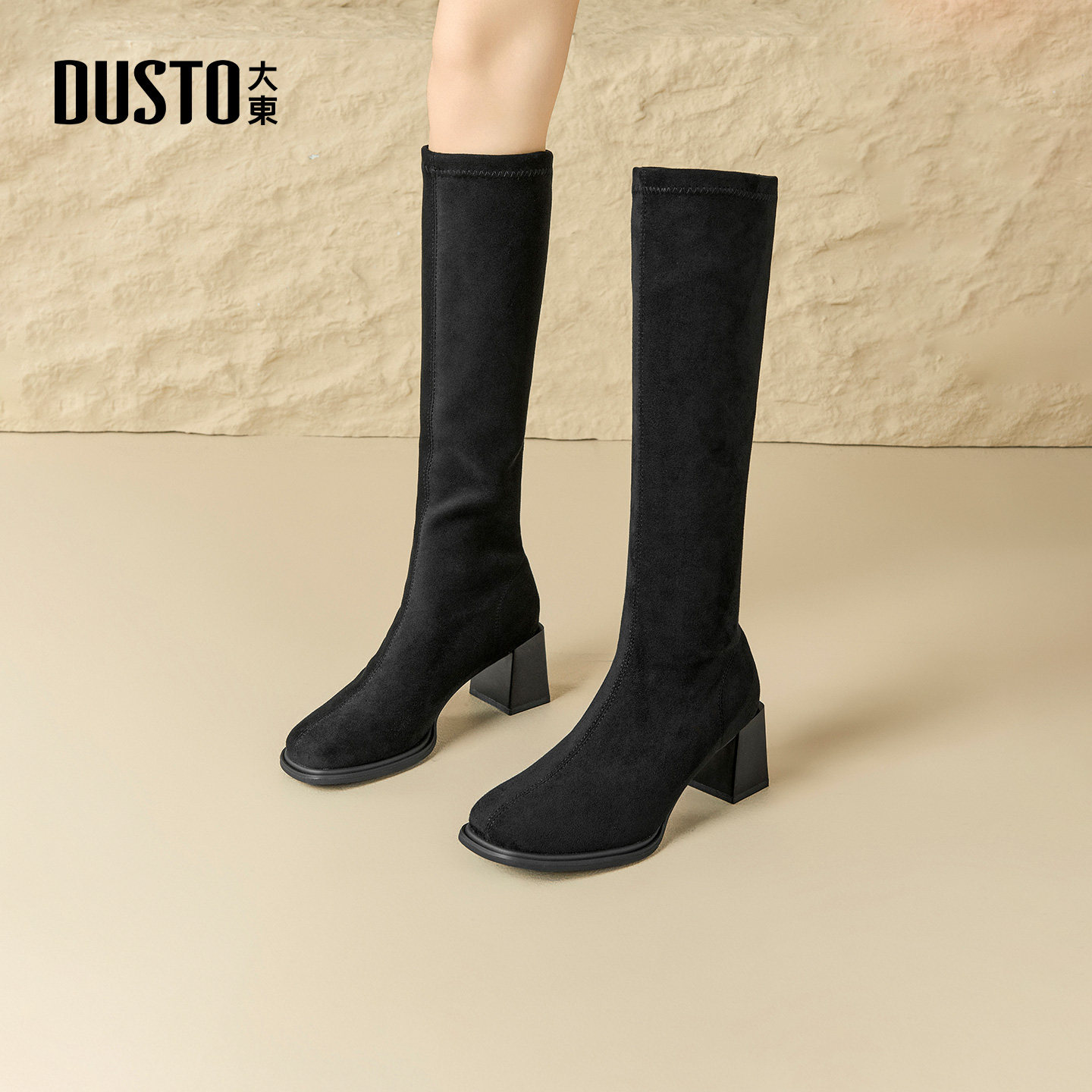 大东粗跟高跟长靴女2025新款秋冬绒面显瘦长筒靴弹力高筒瘦瘦靴子
