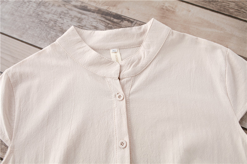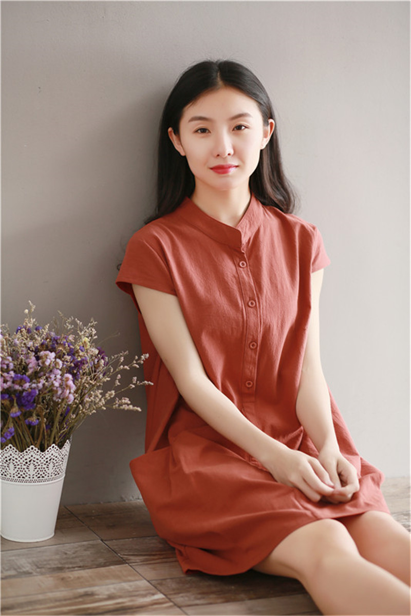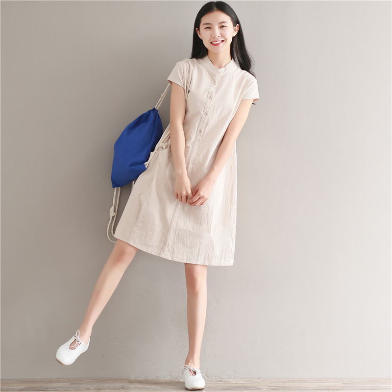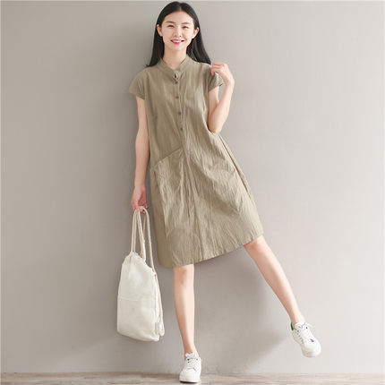 复古文艺森女系棉麻风宽松大码休闲中长款立领半开衫大口袋连衣裙