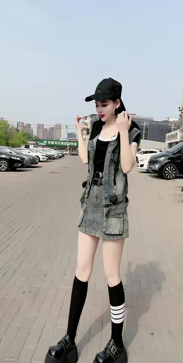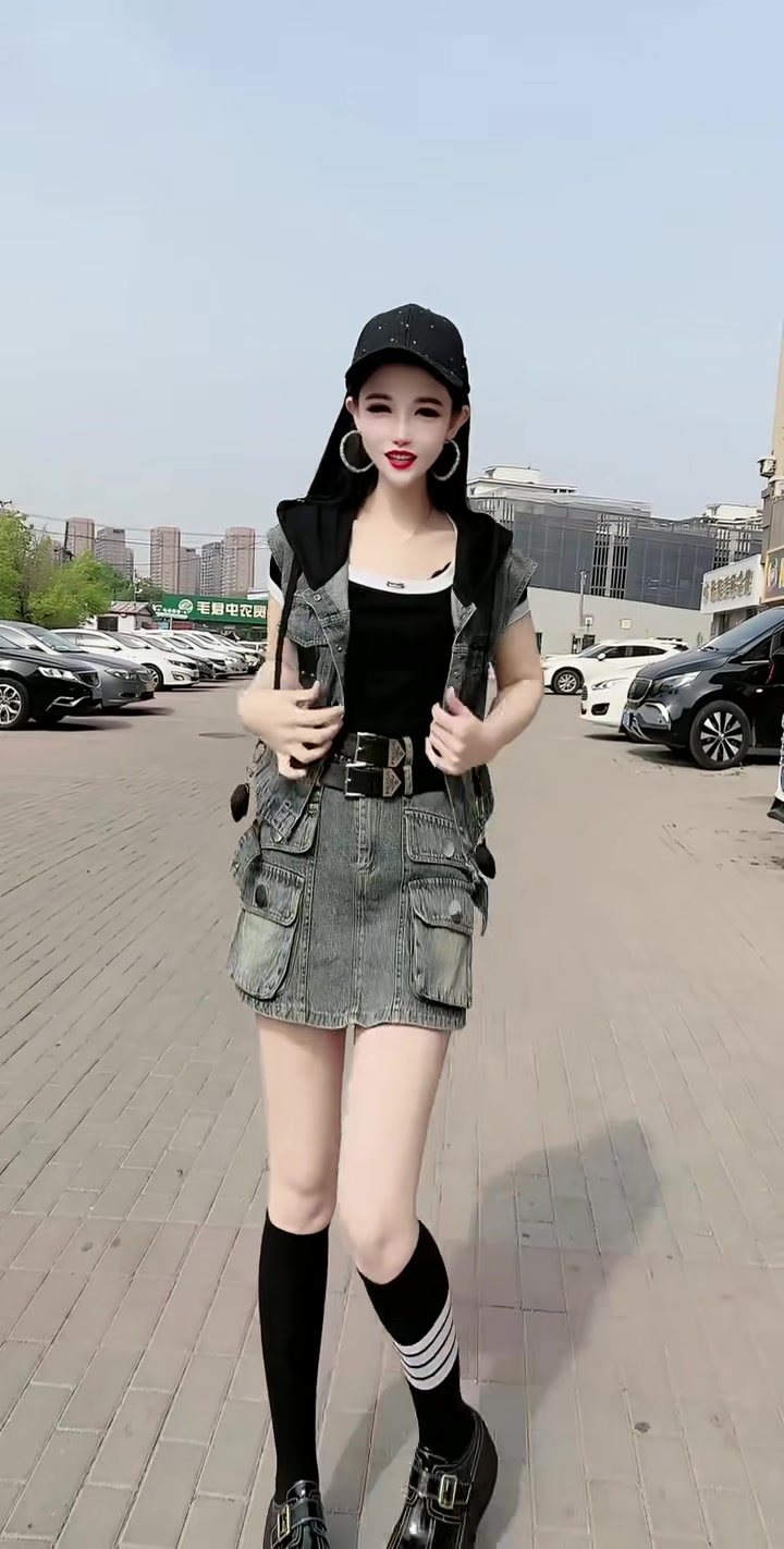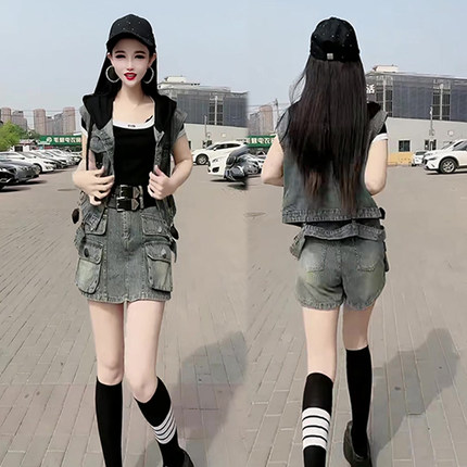 欧货潮流百搭水洗牛仔套装女夏季时尚洋气连帽马甲高腰短裙两件套