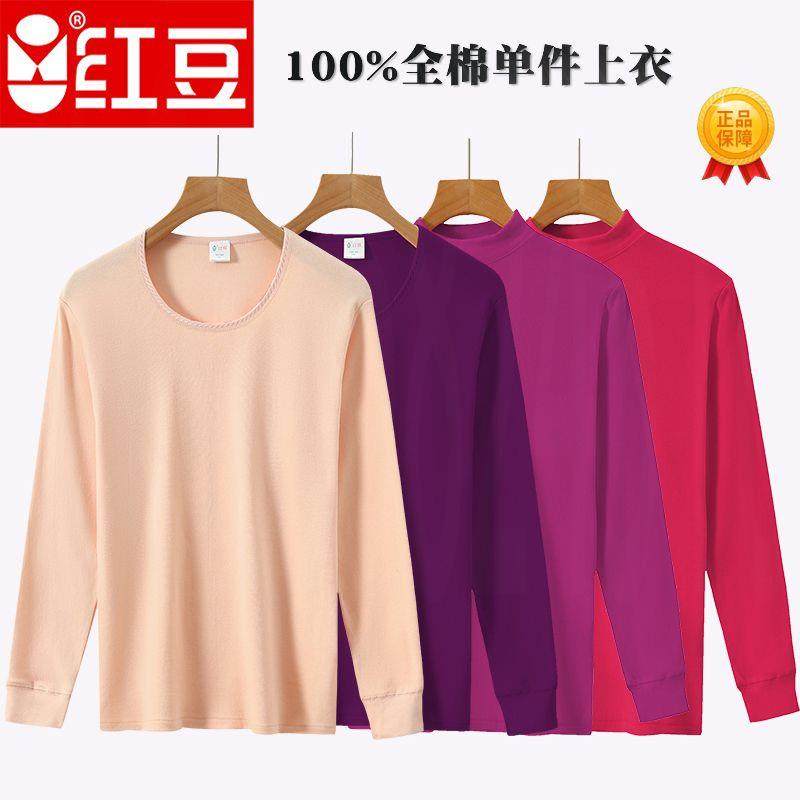 红豆内衣女士单件秋衣全棉宽松大码半高领老年人内穿妈妈圆领打底