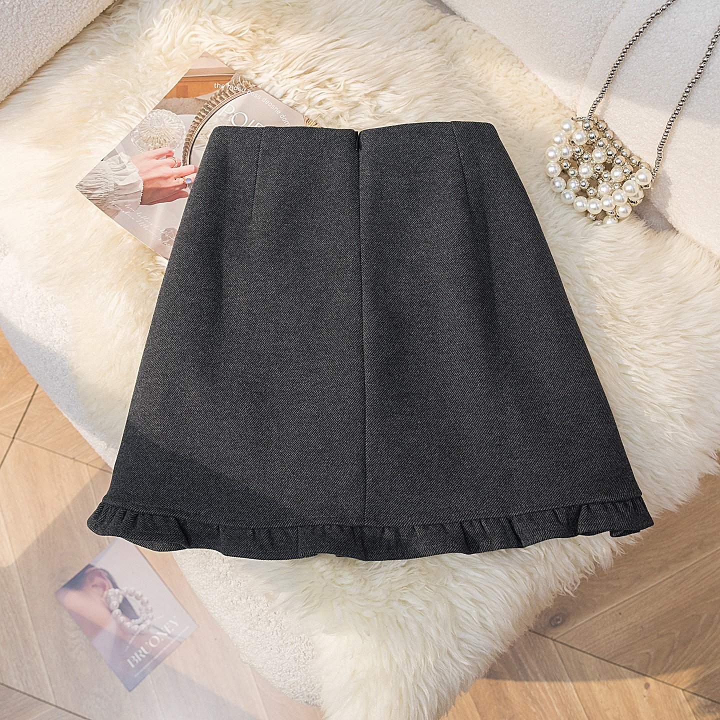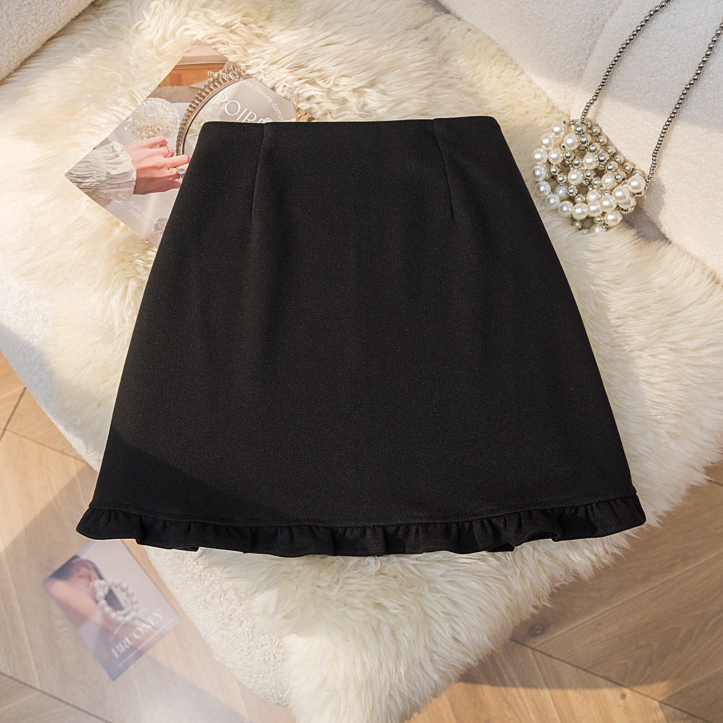 韩系简约气质木耳边毛呢半身裙女秋冬高腰a字包臀裙百搭呢子短裙