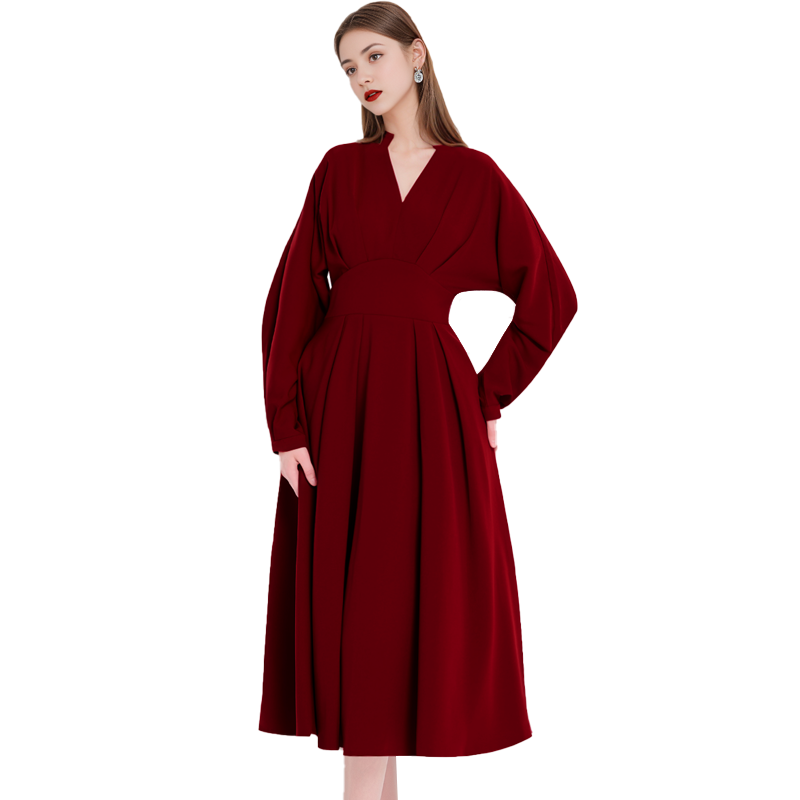 红色长袖连衣裙女法式订婚结婚宴会礼服重要场合v领长裙小众轻奢