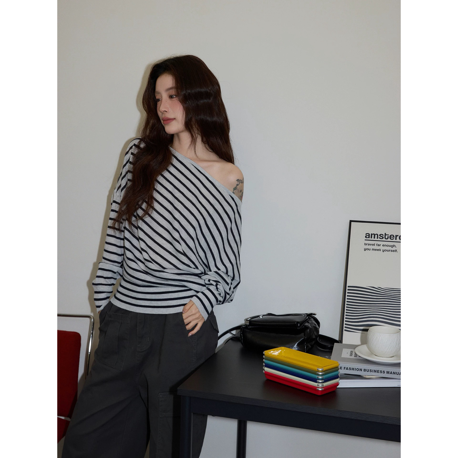 慵懒风撞色条纹一字领露肩针织长袖T恤宽松打底针织衫(含6羊毛)