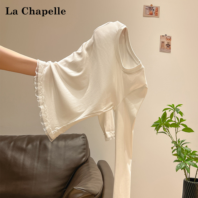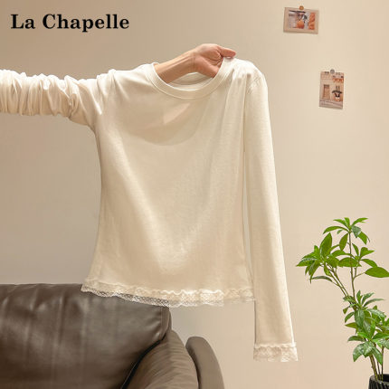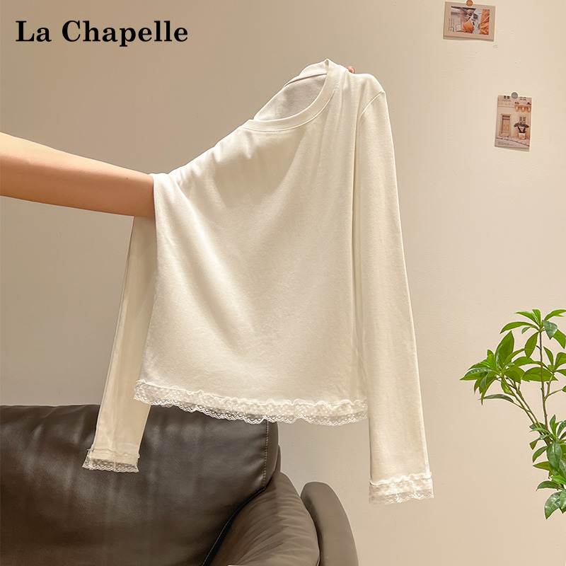 拉夏贝尔法式蕾丝花边拼接圆领长袖T恤女秋季甜美bm风打底衫上衣