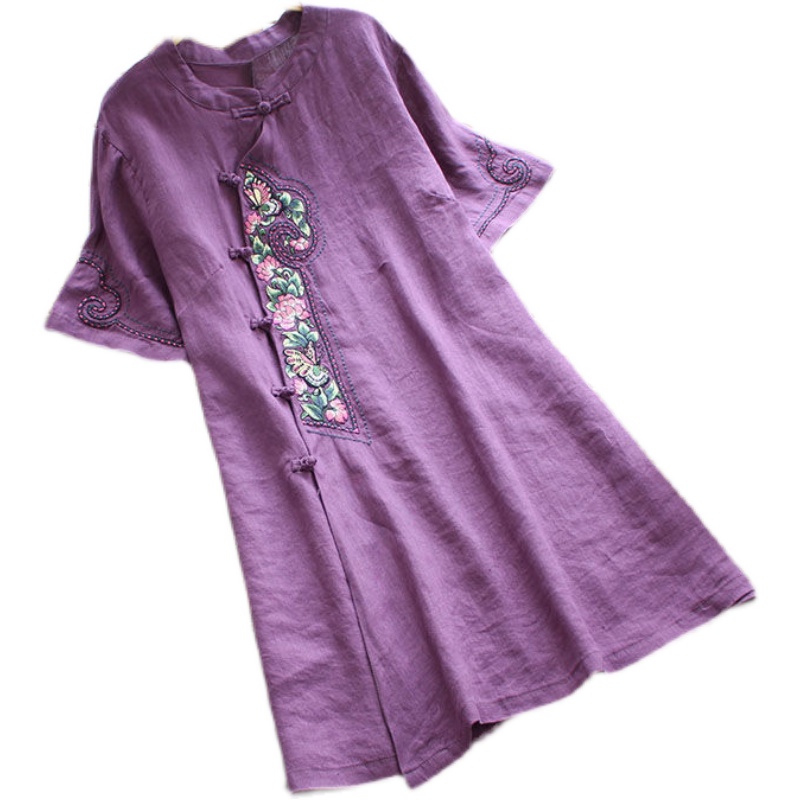 捡漏棉麻连衣裙女2025夏季新款宽松立领刺绣中国风中长款上衣