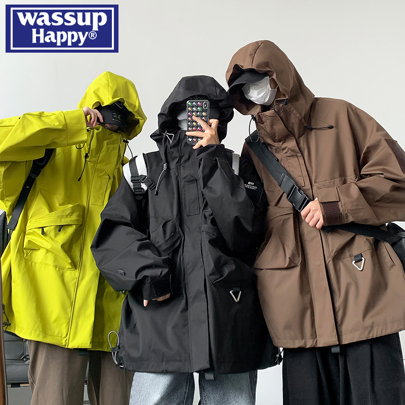 wassup happy冲锋衣外套男春秋季2025新款加肥加大码宽松工装夹克