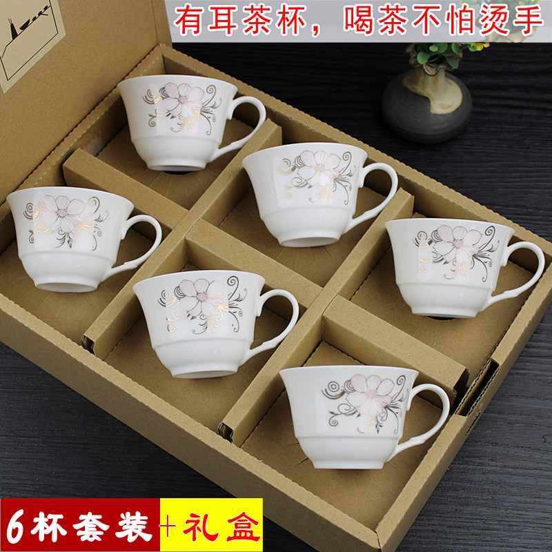 陶瓷茶具有耳功夫茶杯套装青花瓷斗笠杯品茗杯主人带柄把小号礼盒
