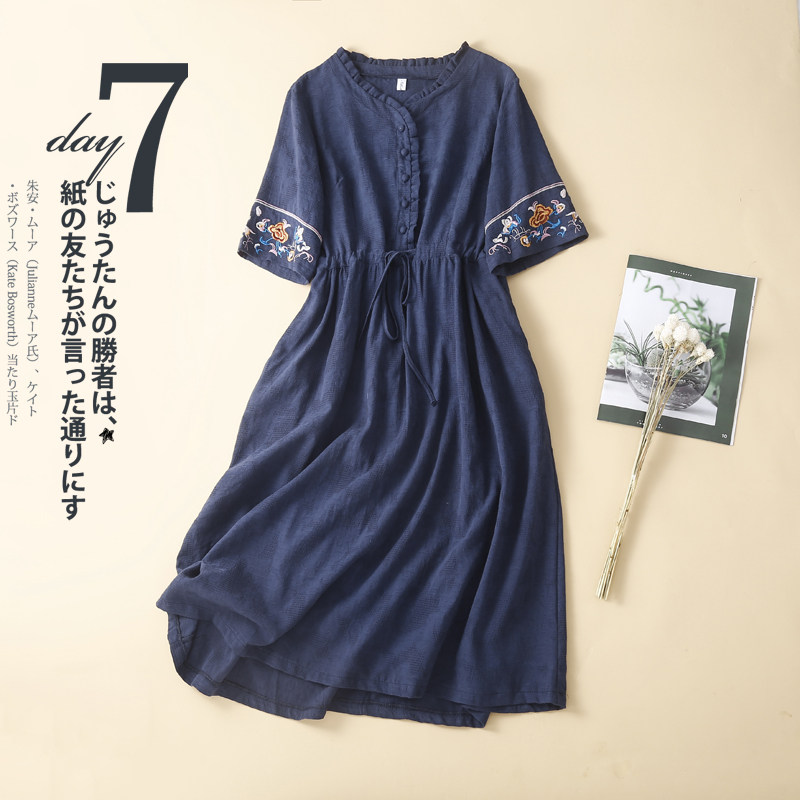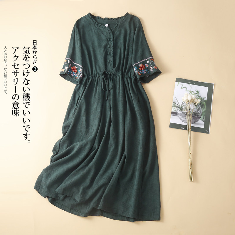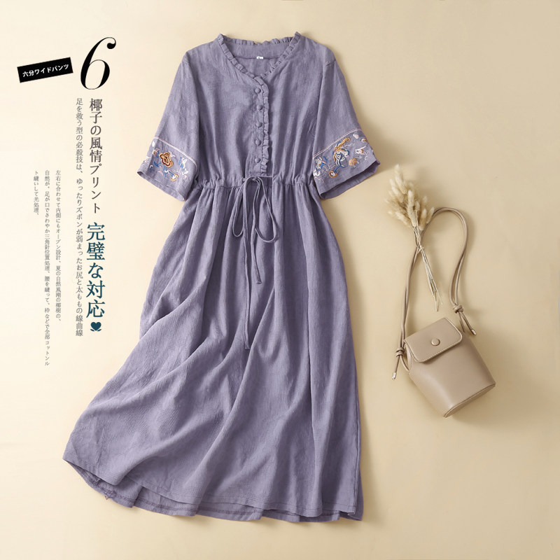 民族风亚麻棉刺绣连衣裙夏季长款过膝麻料气质长裙子宽松森系复古