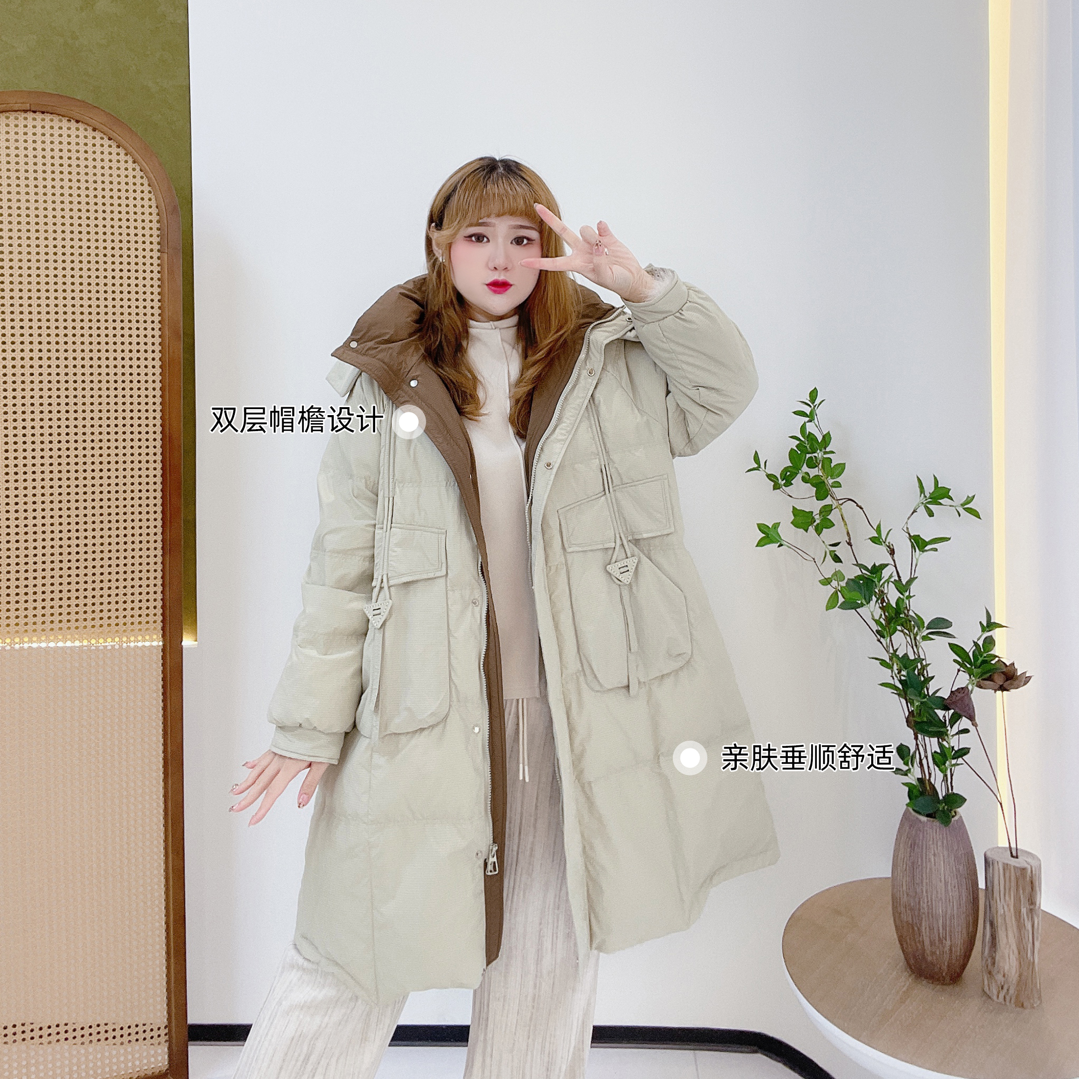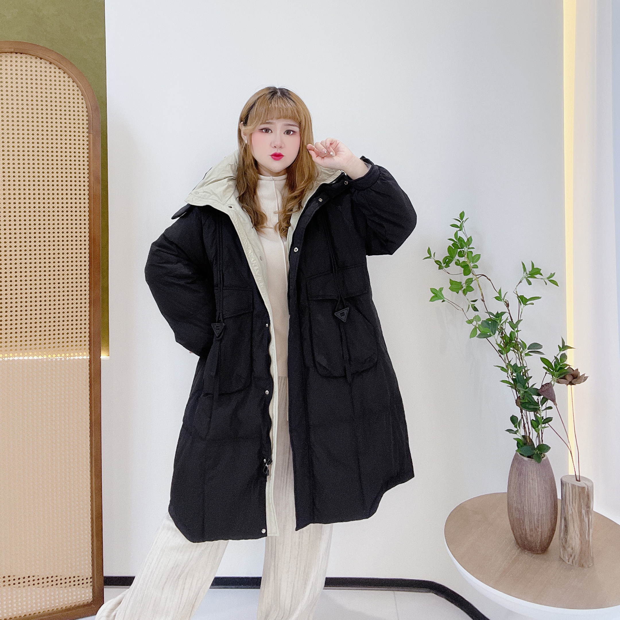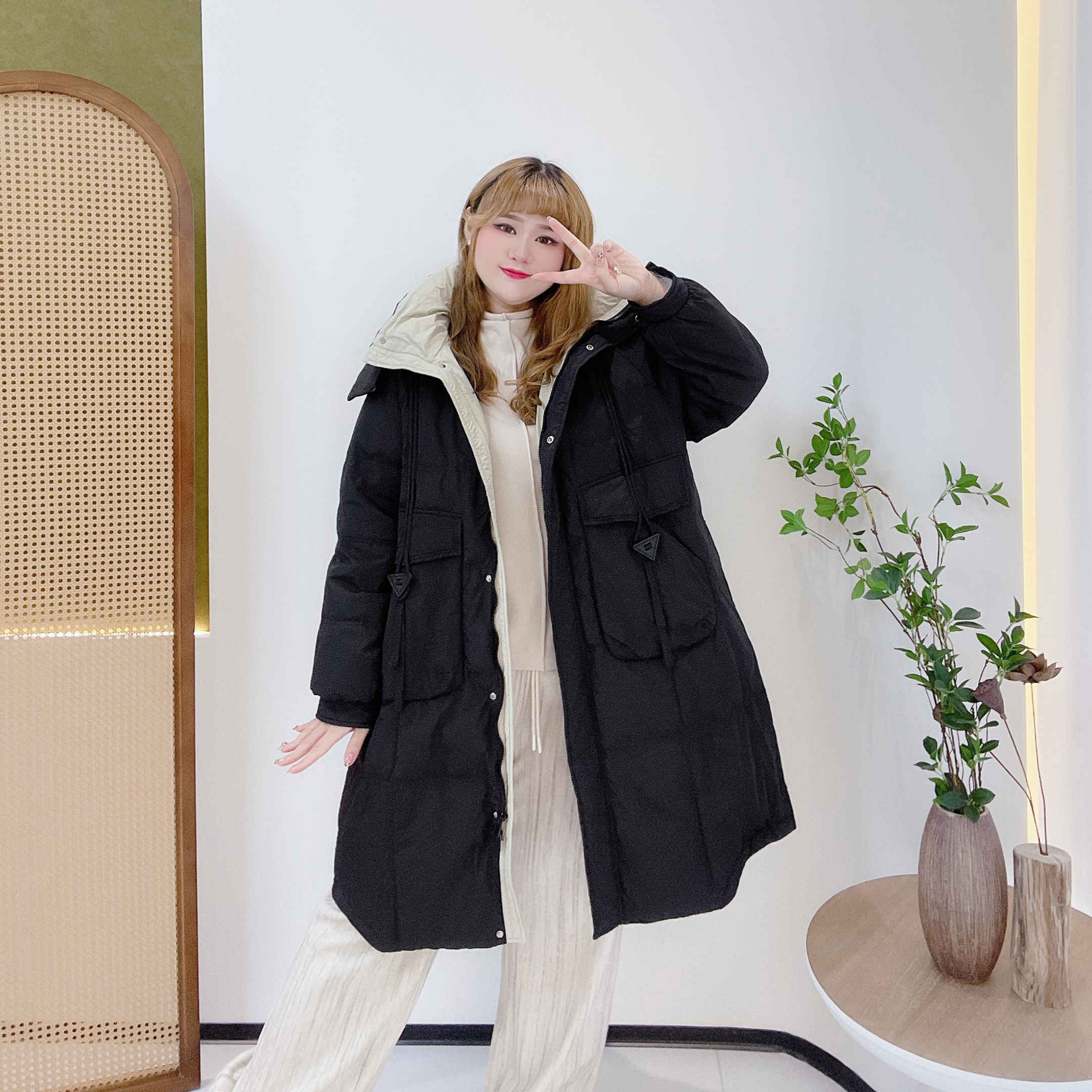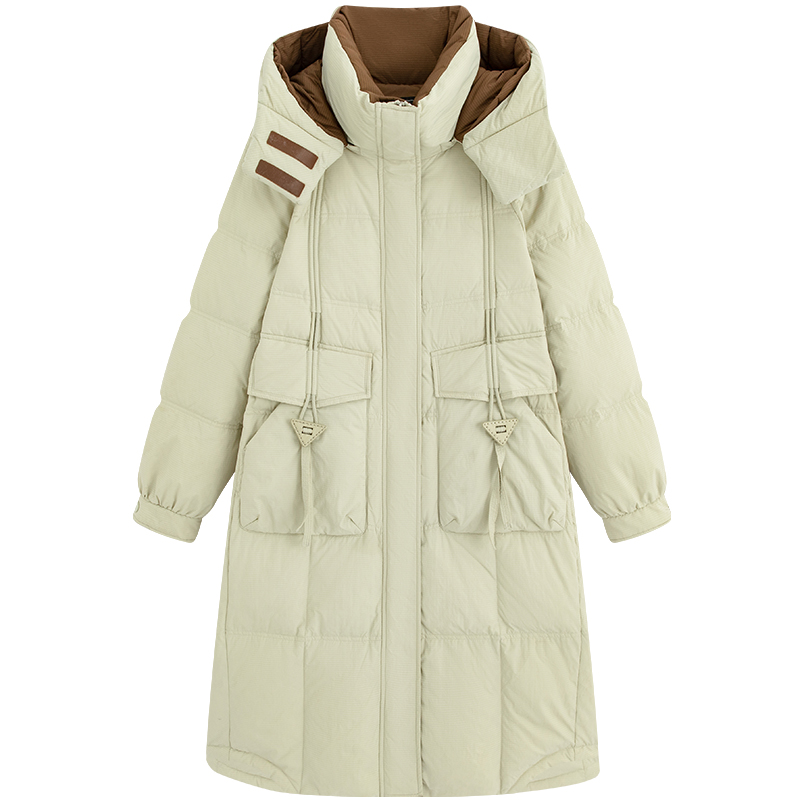 大码韩版撞色中长款羽绒服