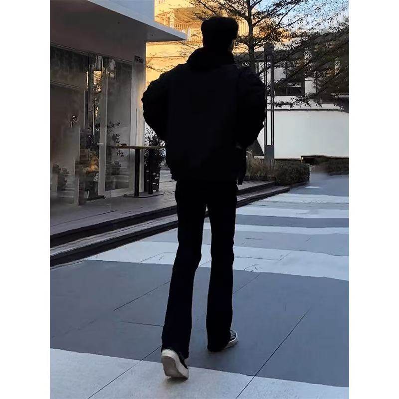 秋冬加绒加厚牛仔裤美式痞帅男款显瘦显高直筒青少年黑色微喇裤子