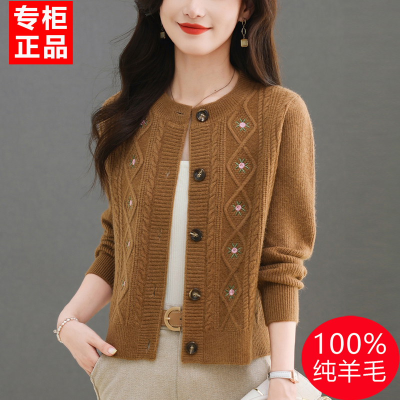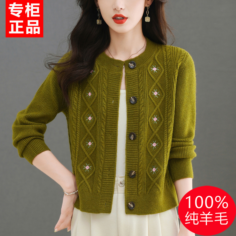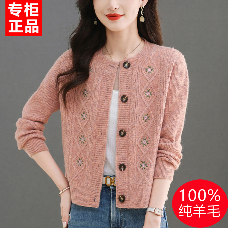 羊毛衫女开 衫高腰短款绣花毛衣小外套圆领针织衫外搭配裙子羊绒
