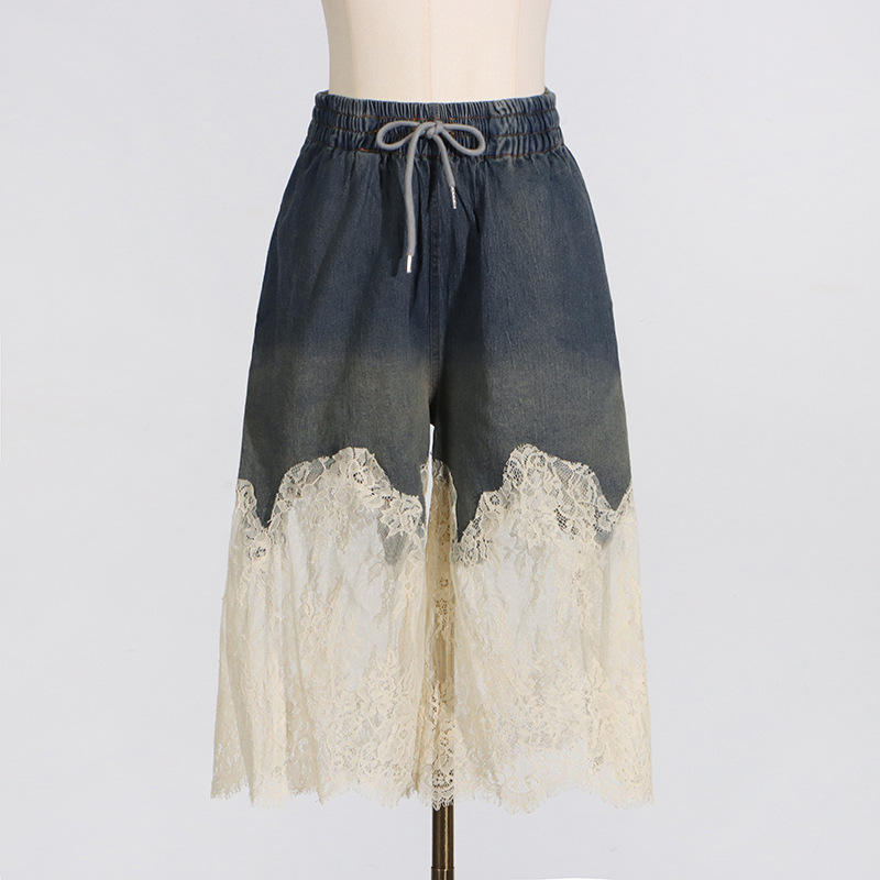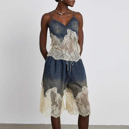 新款 女夏蕾丝两件套简约风上衣+休闲牛仔五分裤时尚薄款女装套装