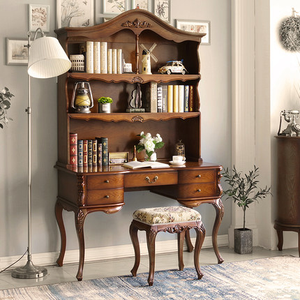 美式实木书桌书柜一体桌办公电脑桌书房成年人欧式学生单人写字台