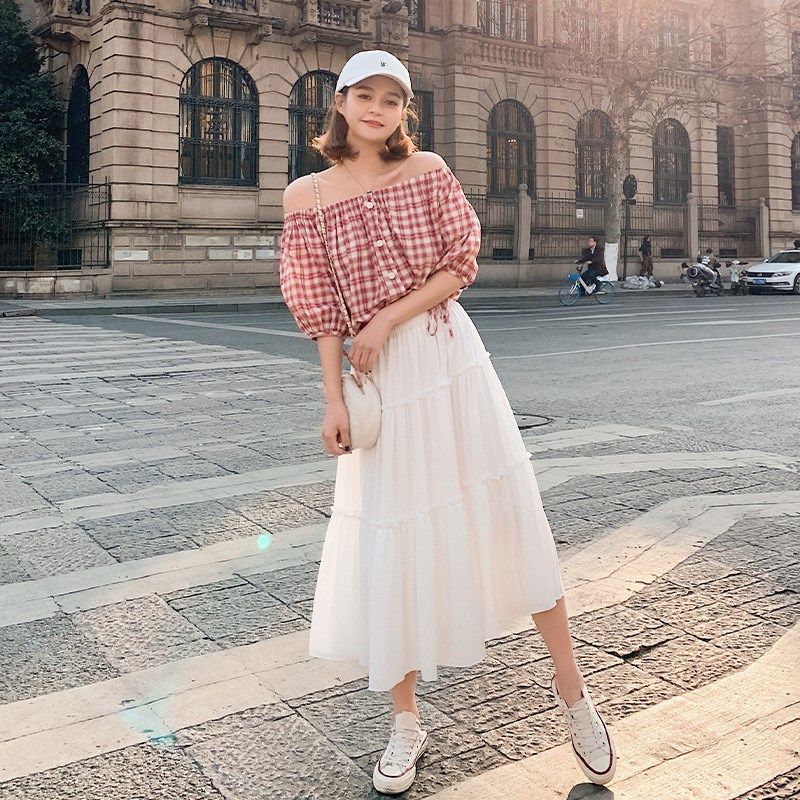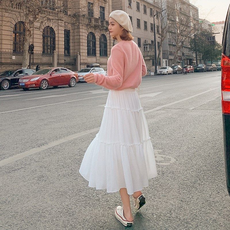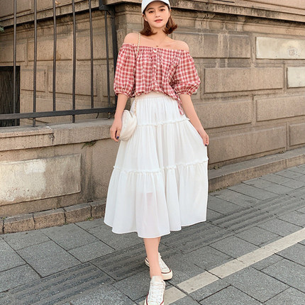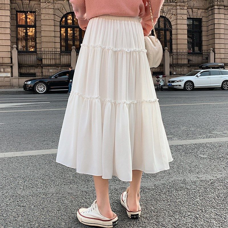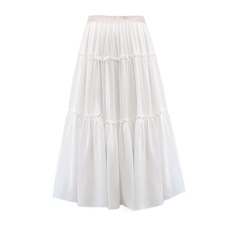 雪纺拼接中长款高腰白色a字半身裙甜美荷叶大摆百褶蛋糕裙仙女夏