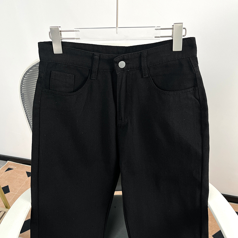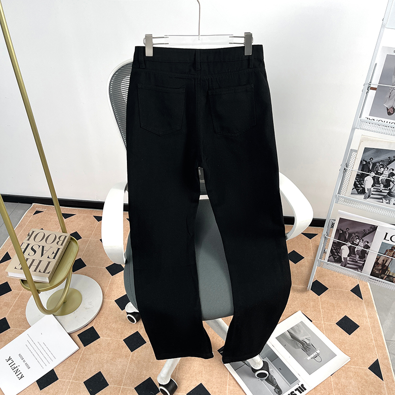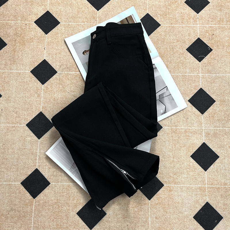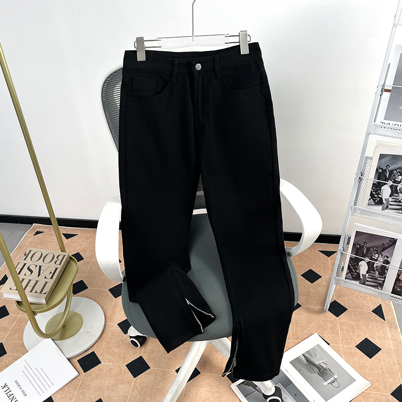 美式高街黑色显高牛仔裤男女潮牌设计感修身小脚开叉拉链显瘦长裤