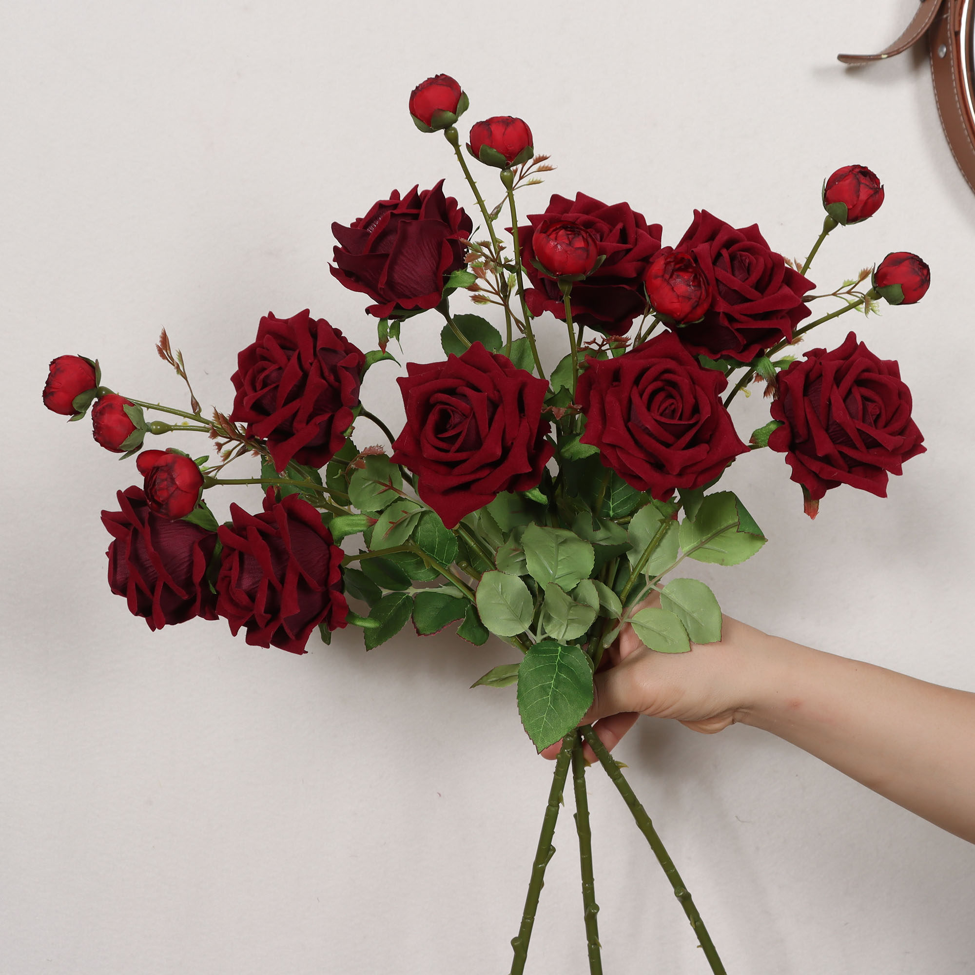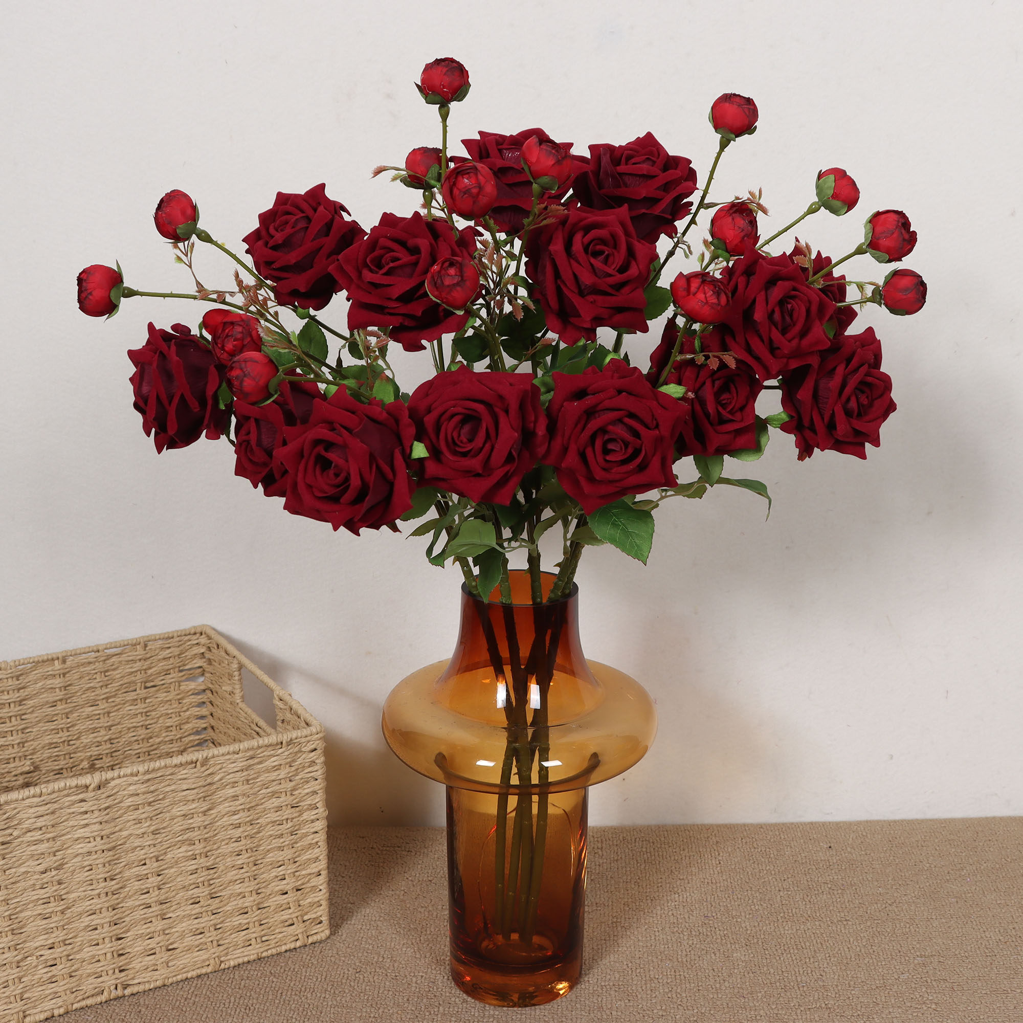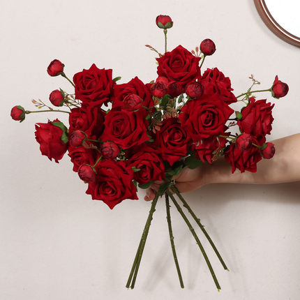 6头卡罗拉红玫瑰仿真花 家居花瓶装饰摆设多头长枝绒布高品质假花