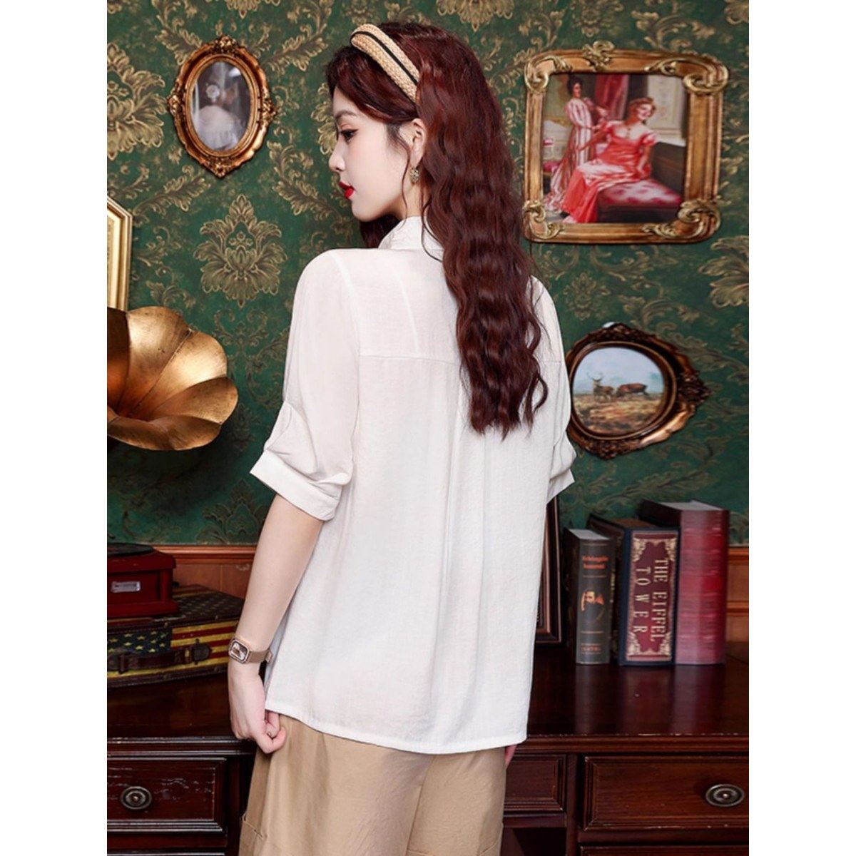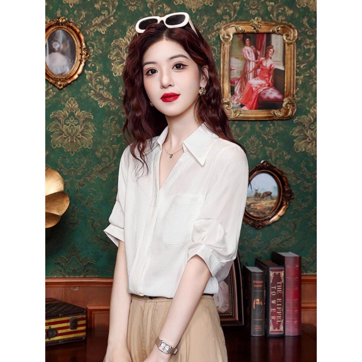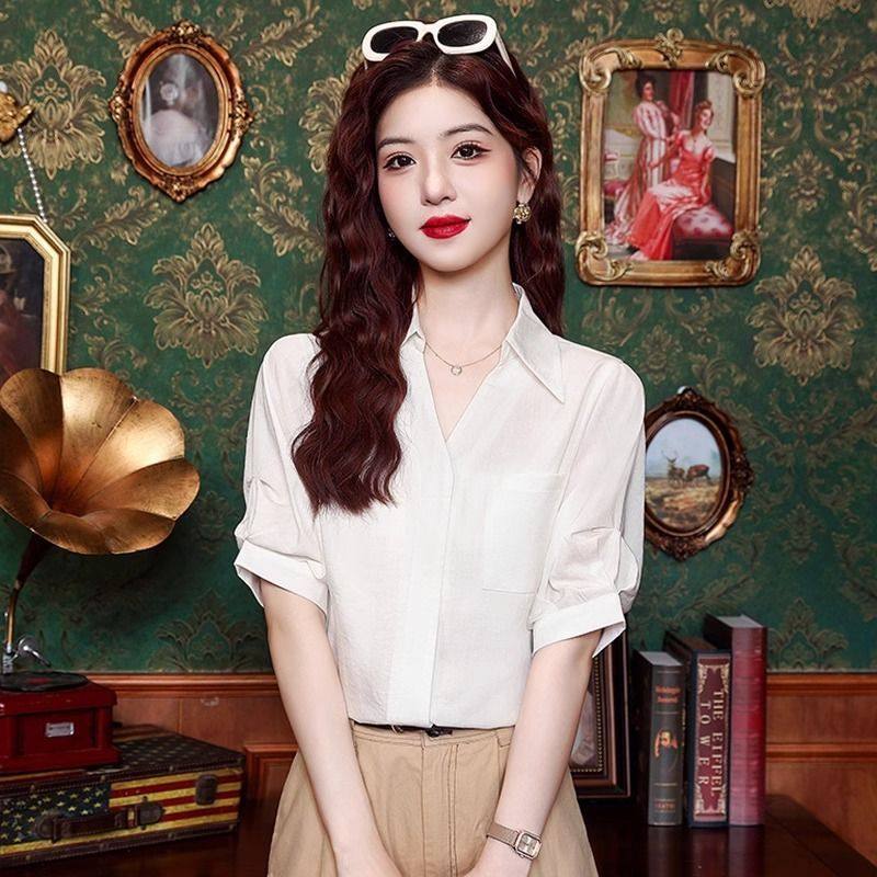 2025年夏季新款套头衬衣短袖t恤女士宽松V领雪纺衬衫百搭显瘦上衣
