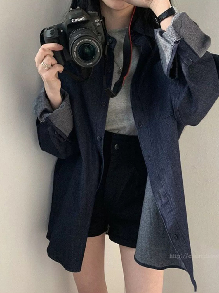 中长款蓝色牛仔衬衫女春秋宽松慵懒风vintage复古洋气休闲薄外套