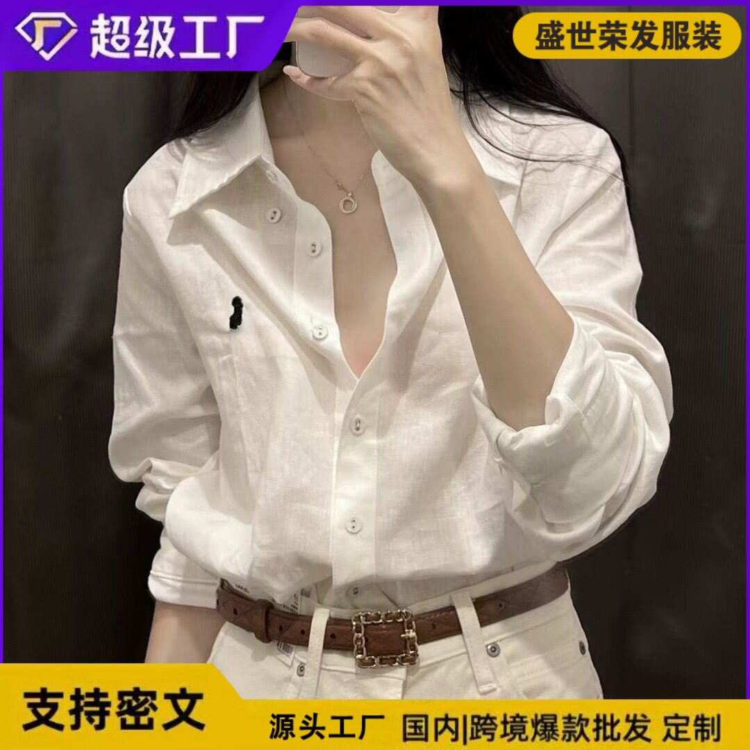 拉夫小马标刺绣上衣女早秋薄款亚麻白色长袖休闲宽松小众防晒衬衫