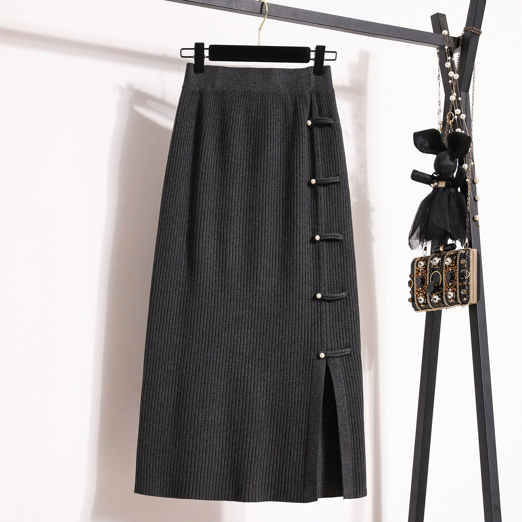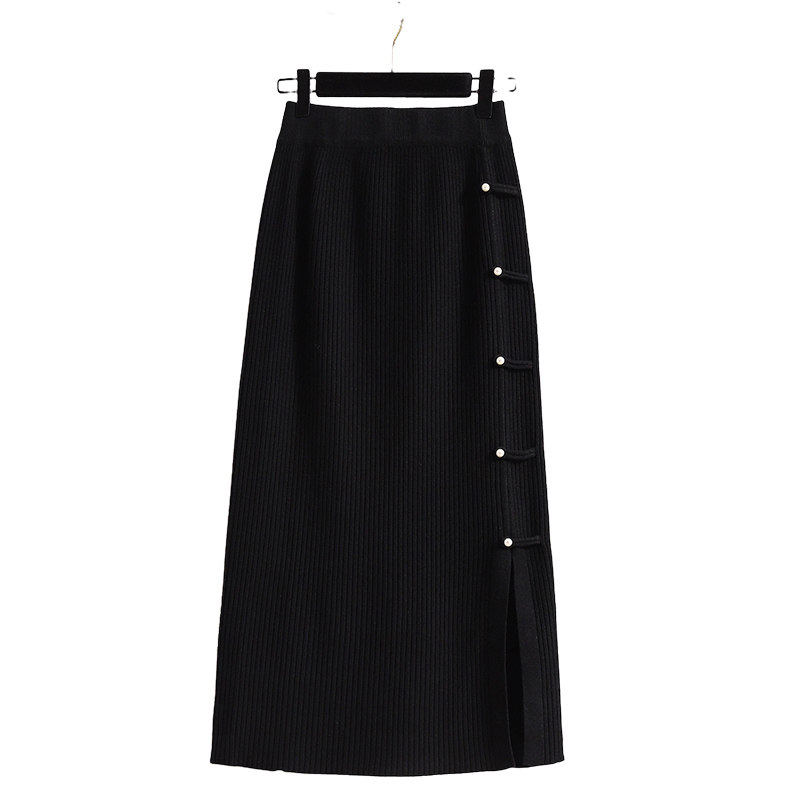 国风盘扣旗袍裙中长款半身裙春季新款大码胖mm梨形显瘦开叉针织裙
