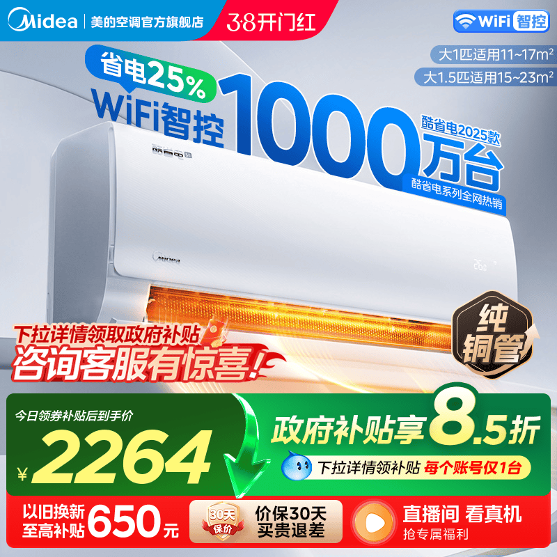 美的酷省电空调家用一级卧室大1.5匹2匹官方变频冷暖正品大挂机