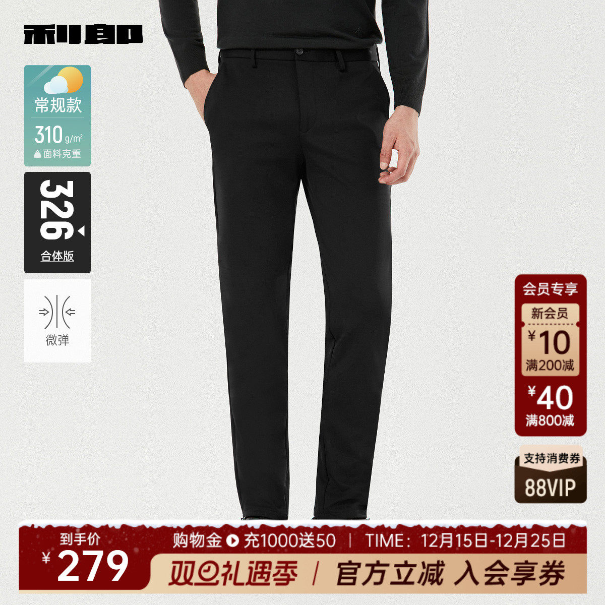 利郎官方 商务休闲裤男士纯色弹力舒适长裤2025秋季新款黑色裤子