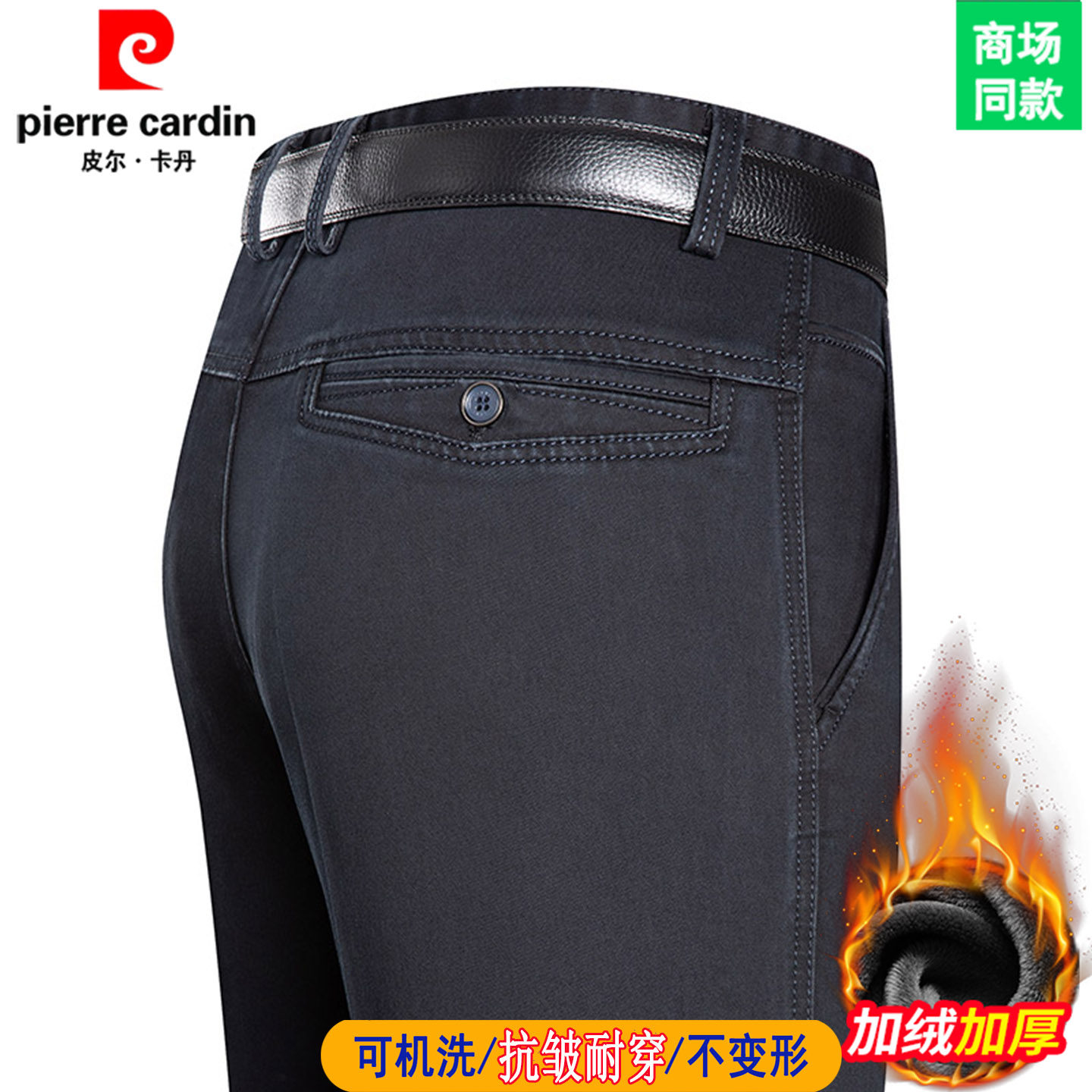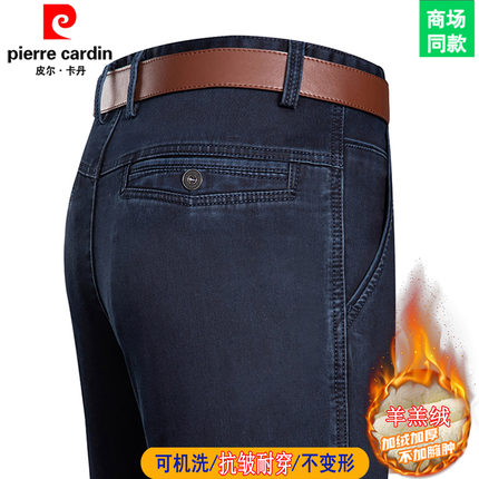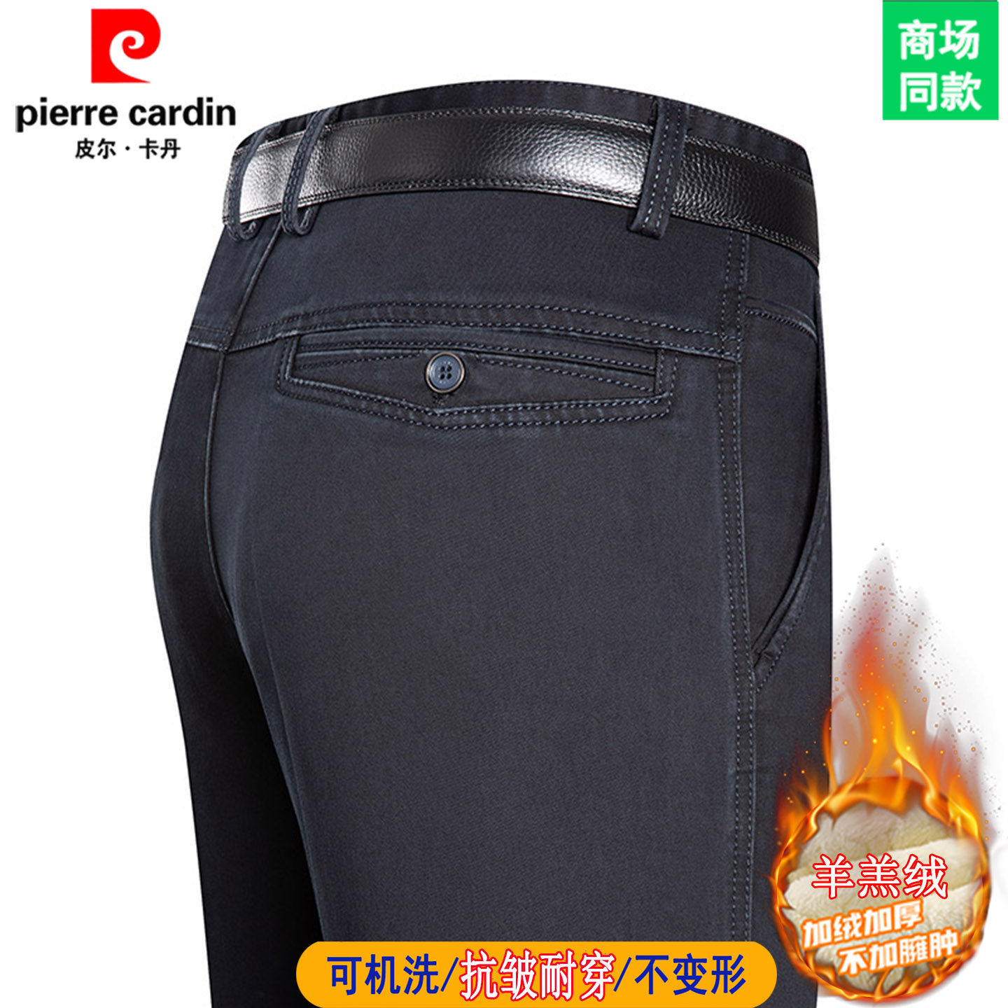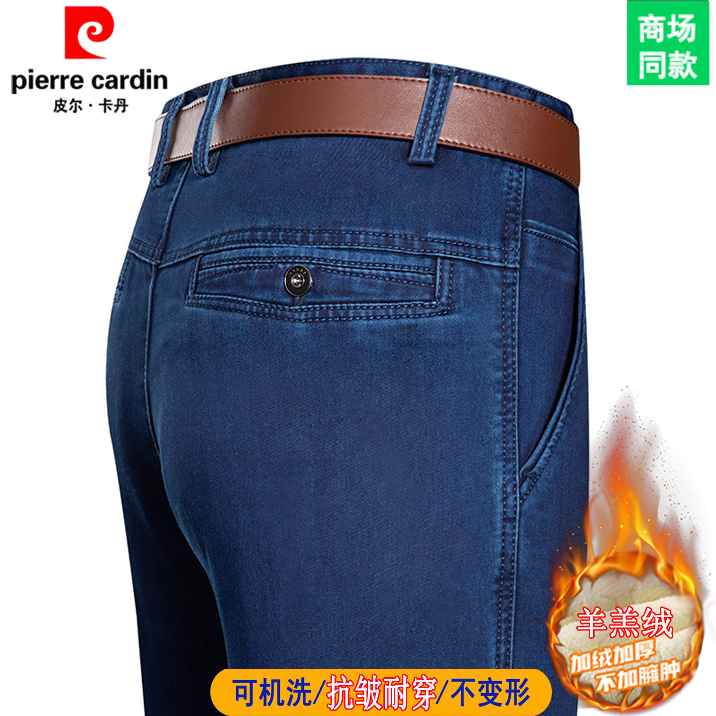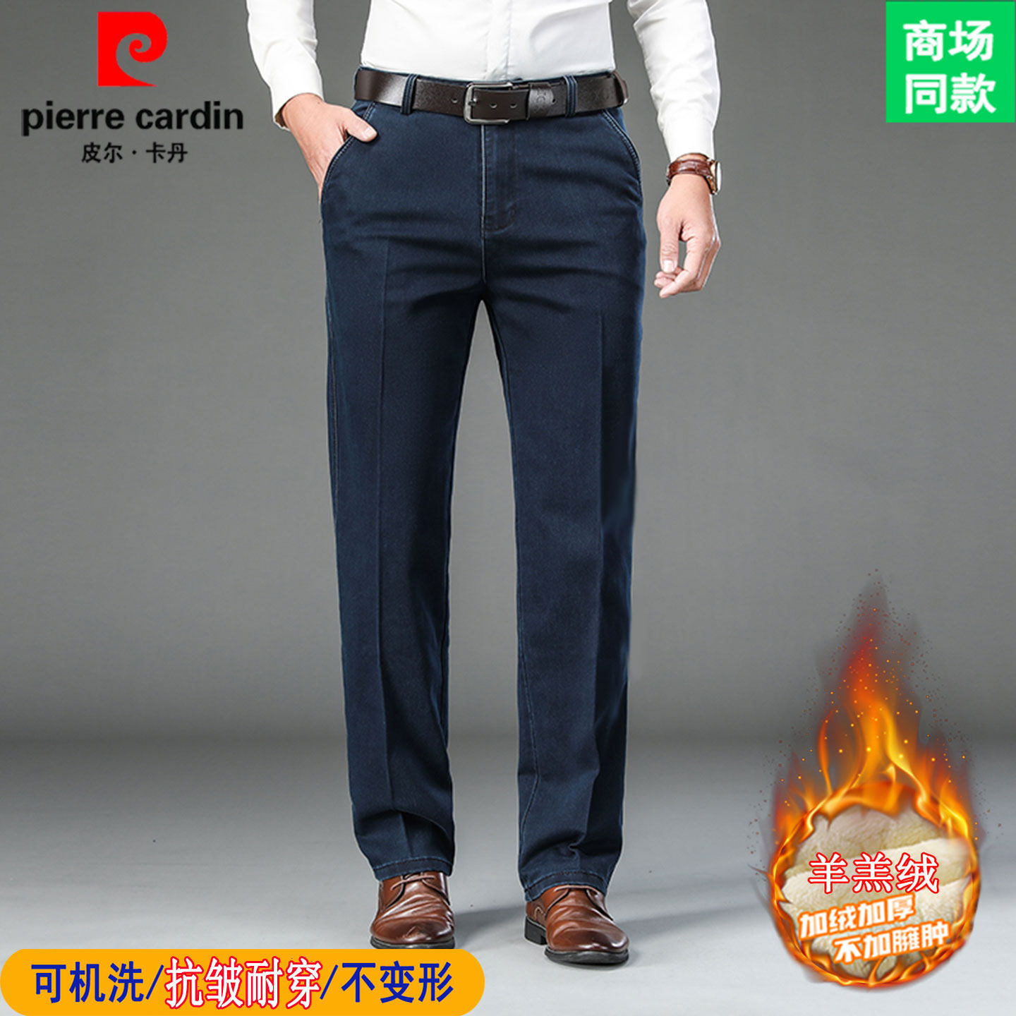 皮尔卡丹高端牛仔裤男士高腰直筒加绒商务休闲裤特厚爸爸羊羔绒裤