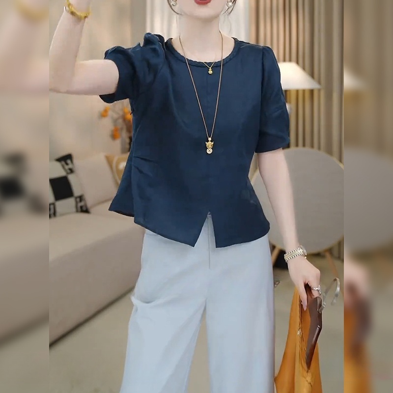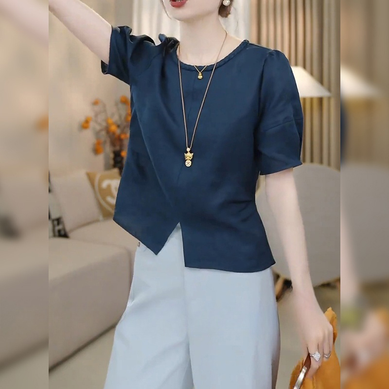 时尚薄款圆领短袖衬衫女夏季新款设计感小众休闲百搭显瘦气质上衣