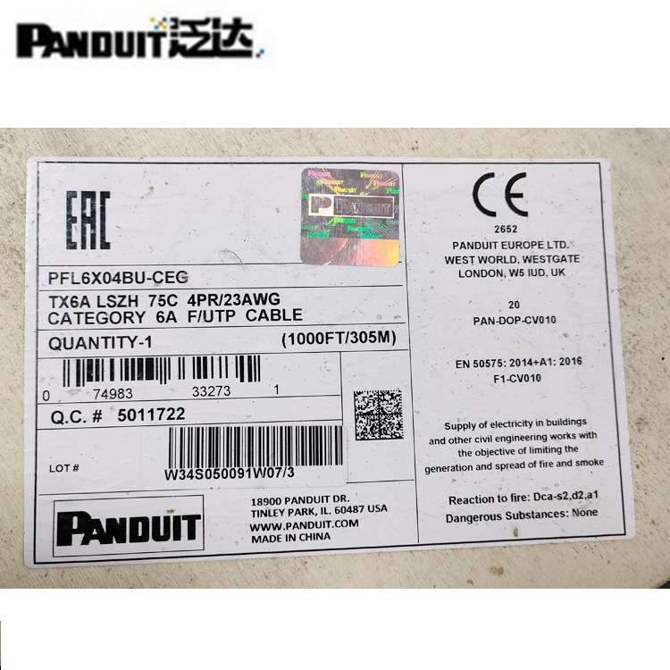原装泛达超六类6A屏蔽低烟无卤LSZH网线PFL6X04BU-CEG双绞线23AWG