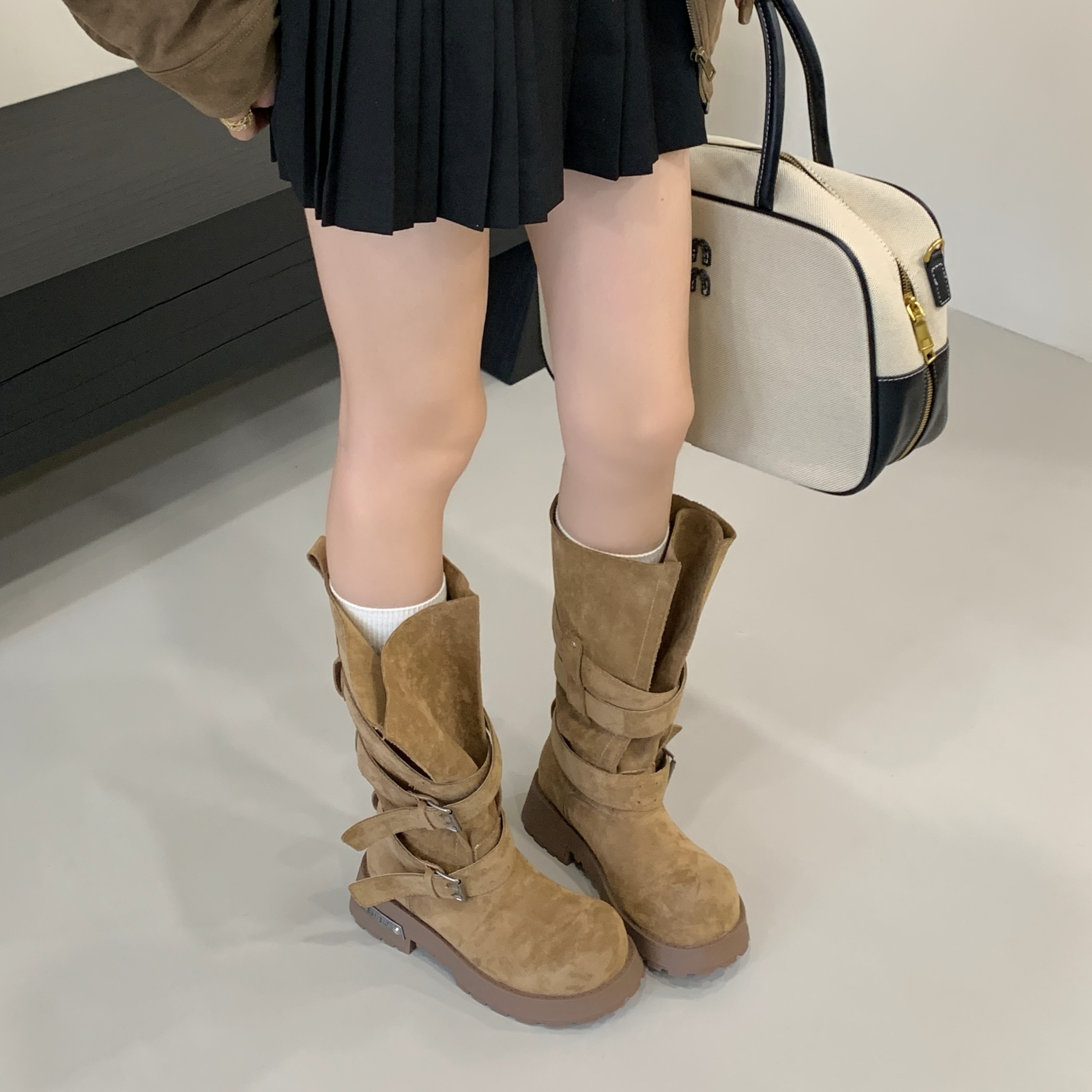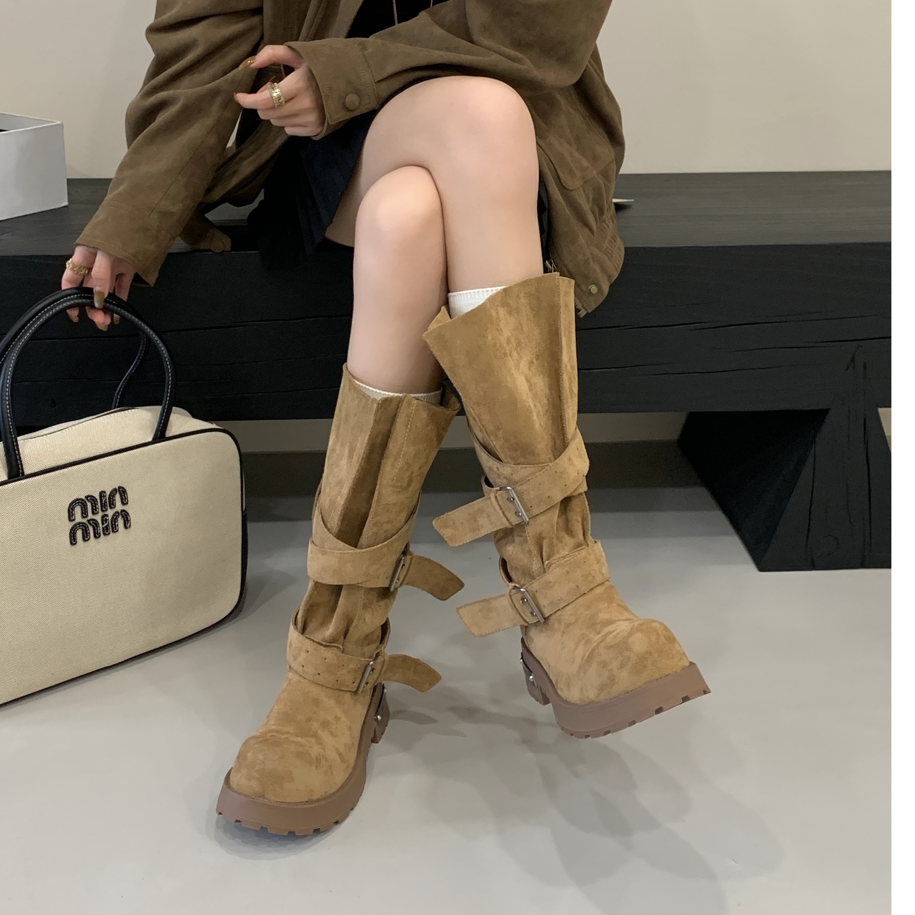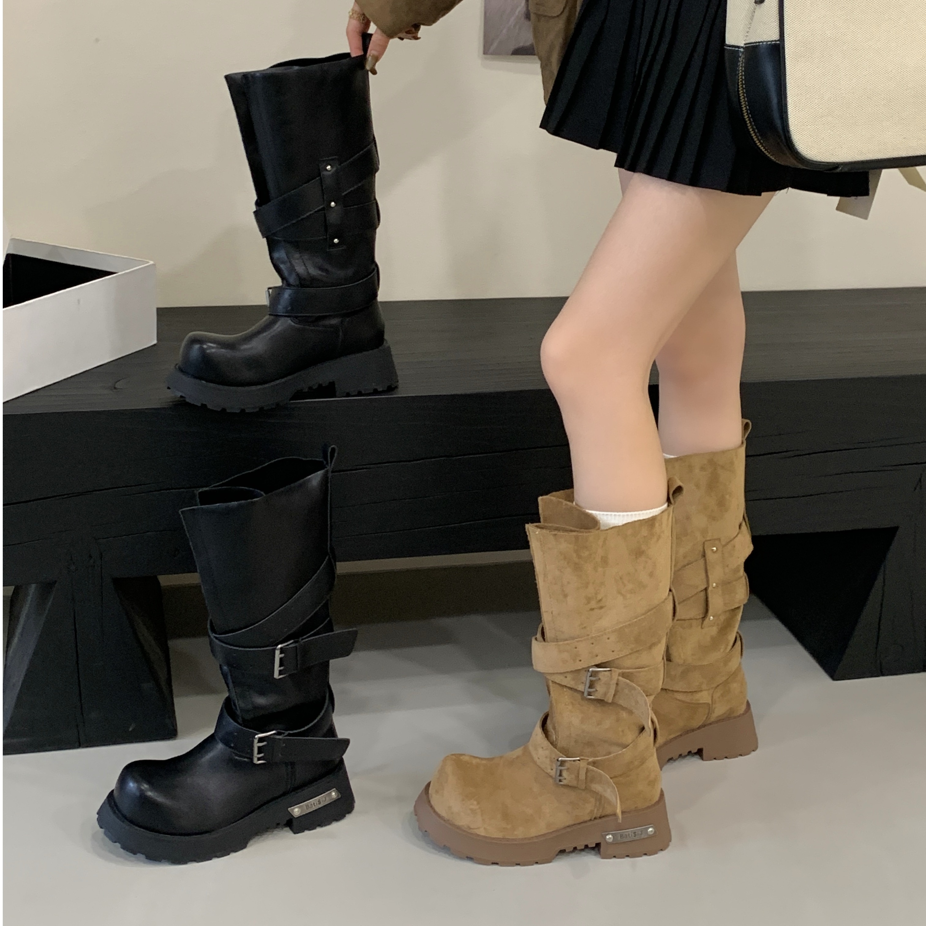 2025秋冬新款复古西部靴粗跟厚底皮带扣粗跟堆堆靴骑士靴女长靴子