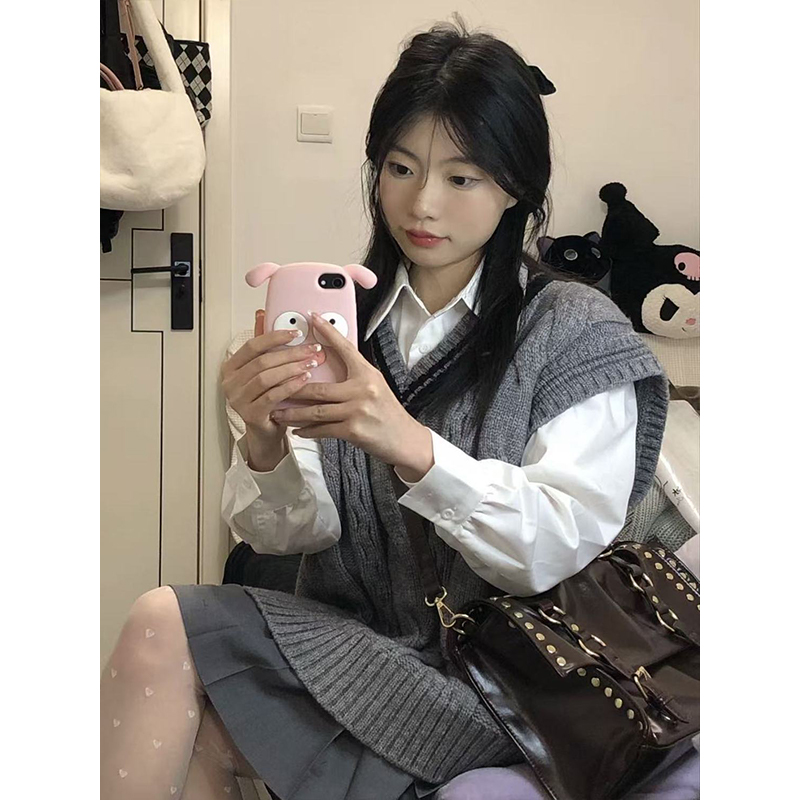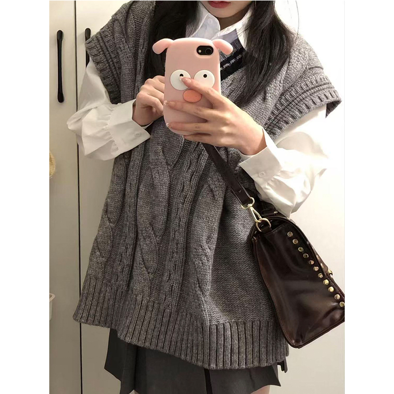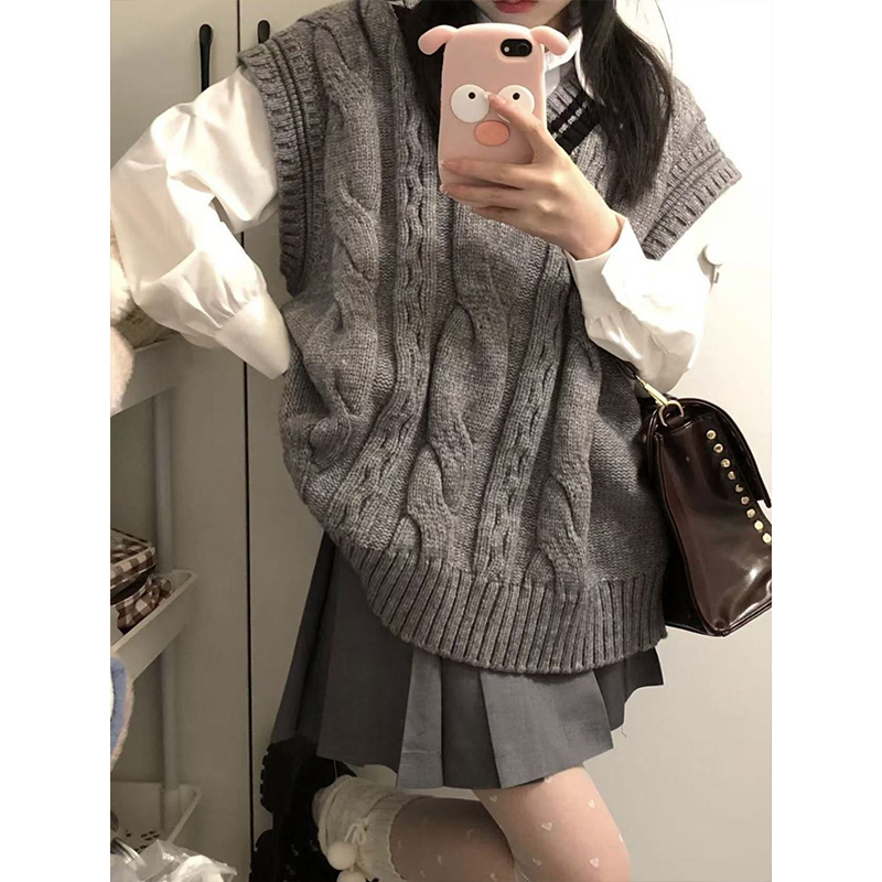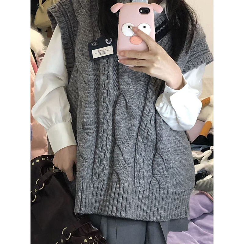两件套装学院风V领宽松拼色麻花针织毛衣马甲背心女学生+白色衬衫