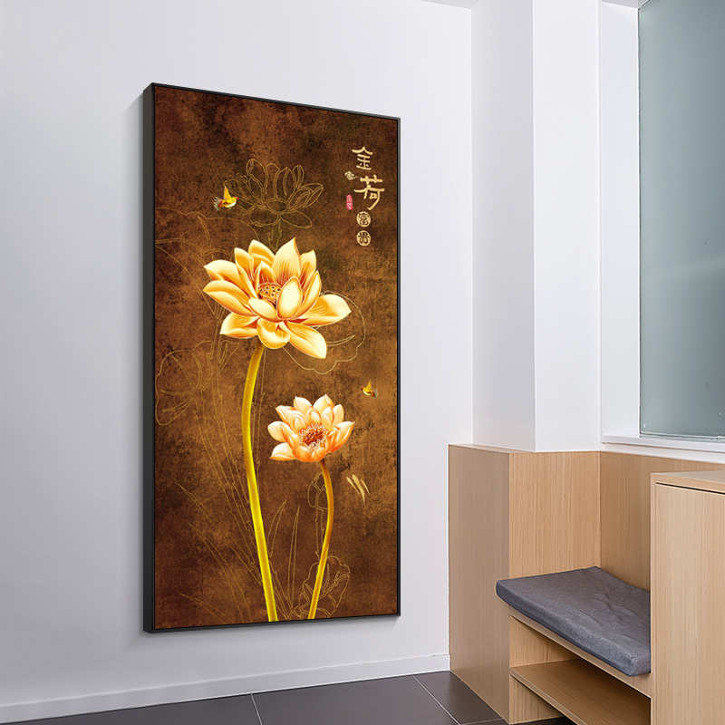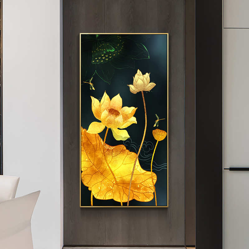 新中式金色荷花玄关装饰画花开富贵莲花竖版客厅挂画走廊过道壁画