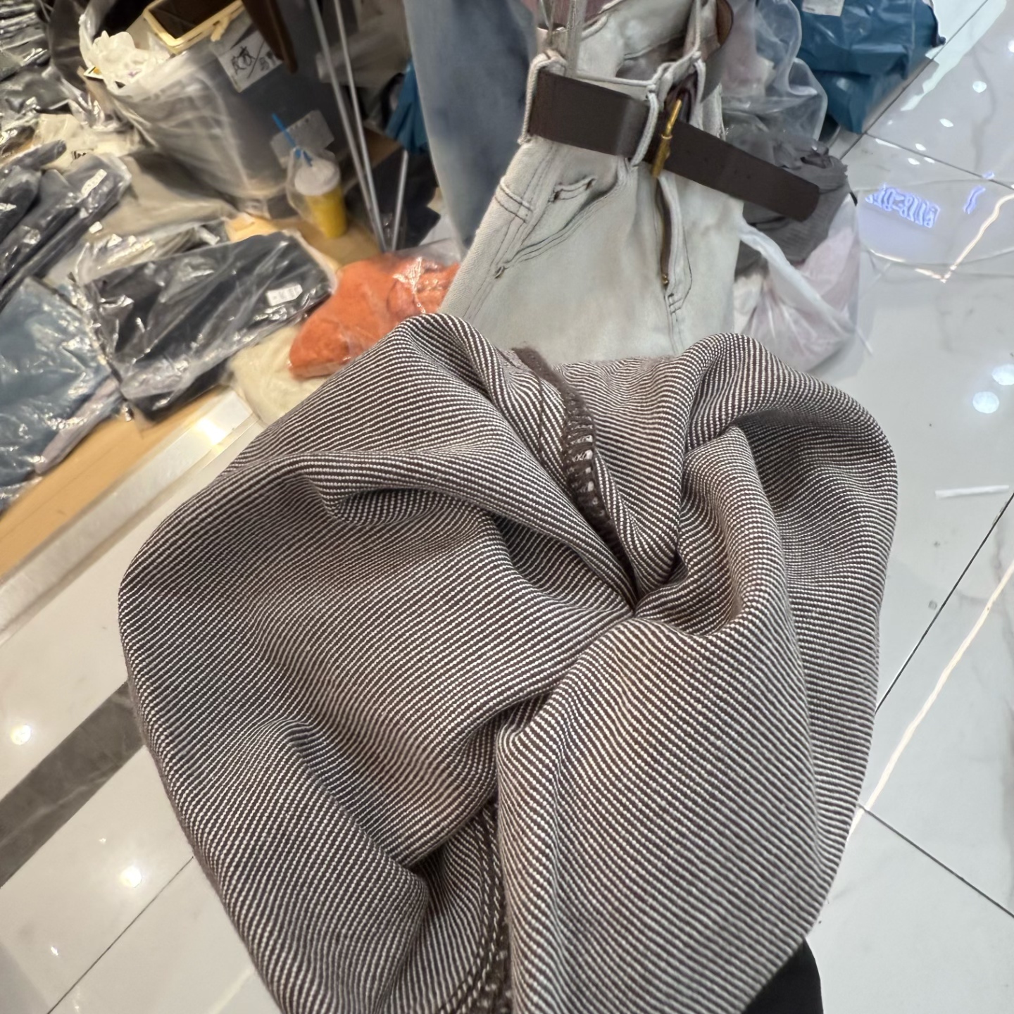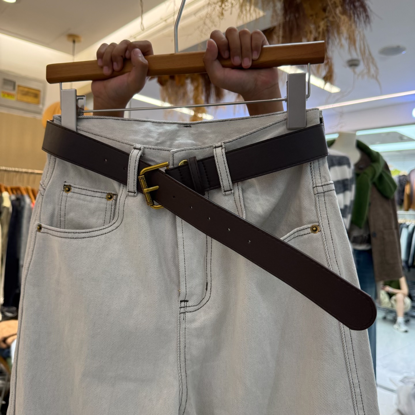 韩版杏灰色卷边宽松牛仔裤